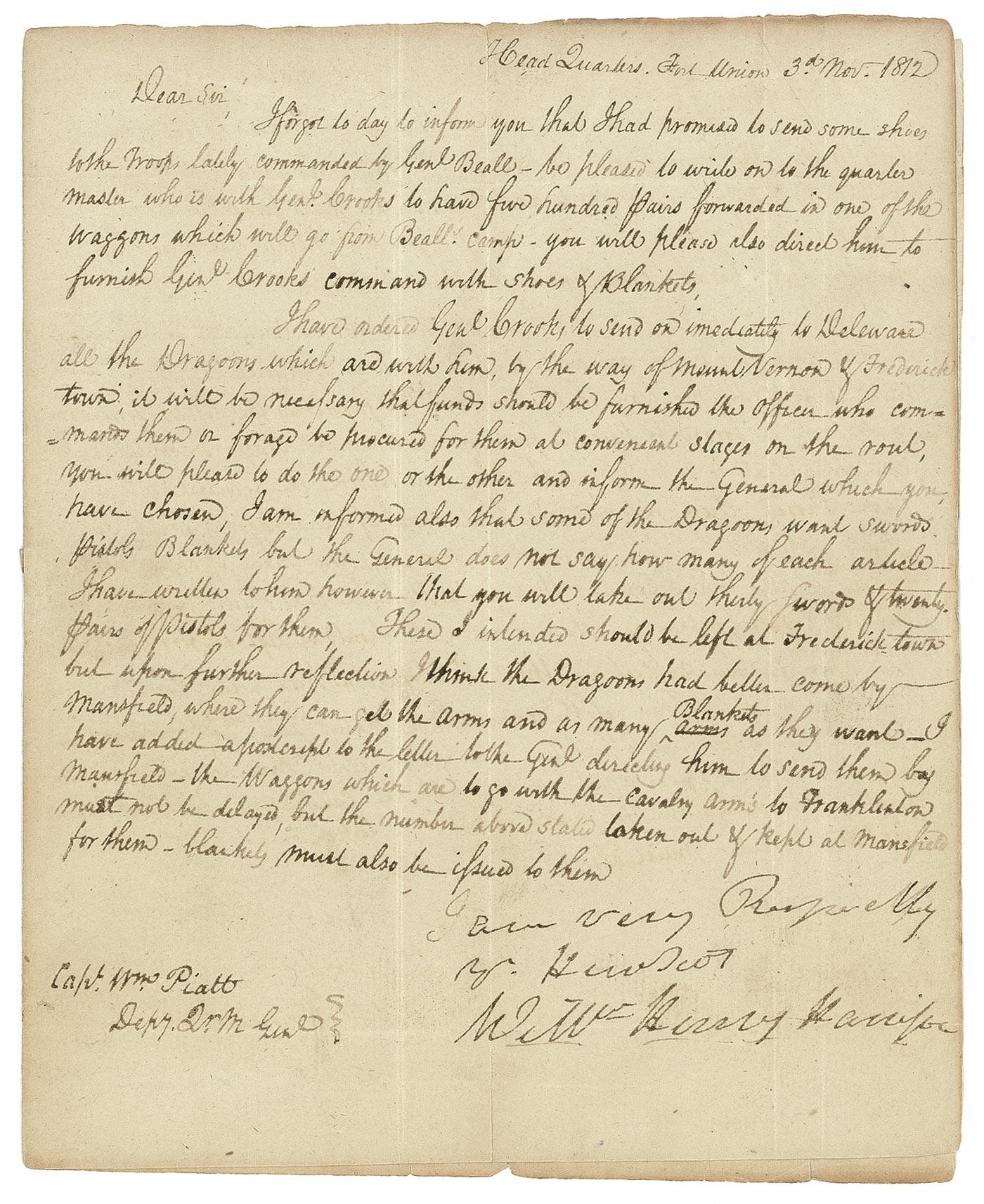 LS signed “Willm Henry Harrison,” one page, 6.25 x 8, November 3, 1812. Letter to Captain William Piatt. In part: “I forgot today to inform you that I had promised to send some shoes to the troops, lately commanded by Genl. Beall—be pleased to write to the quartermaster who is with Genl. Crooks to have five hundred pairs forwarded in one of the waggons [sic] which will go from Bealls camp—will you please also direct him to furnish Genl. Crooks command with shoes & blankets.