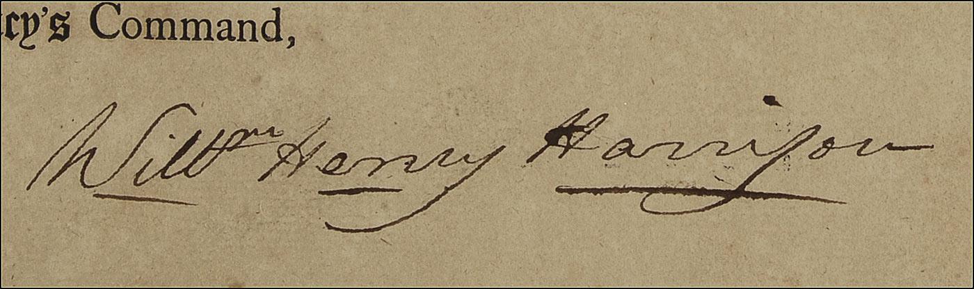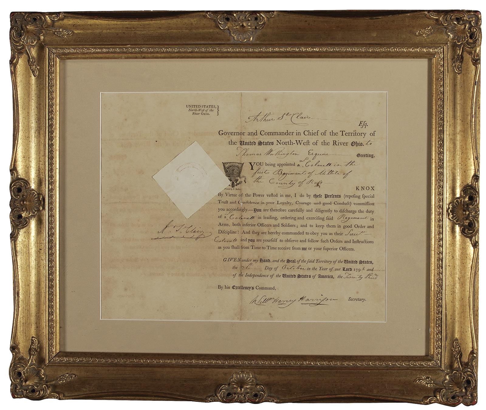 Partly-printed DS, signed “Willm Henry Harrison,” one page, 15 x 12.25, October 26, 1798. Military commission appointing Thomas Worthington, “a Colonel in the first Regiment of Militia of the county of Ross.” Signed on the left side by Northwest Territory Governor “A. St. Claire,” and signed at the bottom by Harrison as secretary. Matted and framed to an overall size of 24.5 x 20.5. In very good condition, with partial separations and paper loss along intersecting folds, some scattered light toning and soiling, and light overall mirroring of text. The white paper seal is intact and mostly crisp. Oversized.