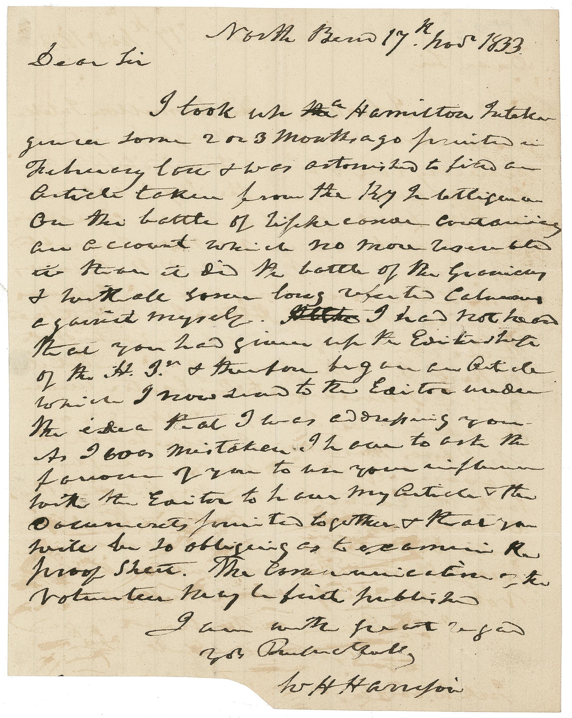 ALS signed “W. H. Harrison,” one page, lightly-lined, 6 x 7.5, November 17, 1833. Letter to an unidentified correspondent (former editor of the Hamilton Intelligencer). In full: “I took up a Hamilton Intelligencer given to me some 2 or 3 months ago printed in February last & was astonished to find an article taken from the Ky Intelligencer on the battle of Tippecanoe containing an account which no more resembled it than it did the battle of Granicus [Alexander the Great, 334 BC] & with all some long repeated calumnies against myself. I had not heard that you had given up the Editorship of the H. Ier & therefore began an article which I now draw to the Editor under the idea I was addressing you. As I was mistaken I have to ask the favour of you to use your influence with the Editor to have my article & the documents printed together & that you will be so obliging as to examine the proof sheet. My communication of the volunteers may be first published.” Trimmed lower left edge, small mounting remnant to reverse, and some light mirroring of ink, otherwise fine condition.