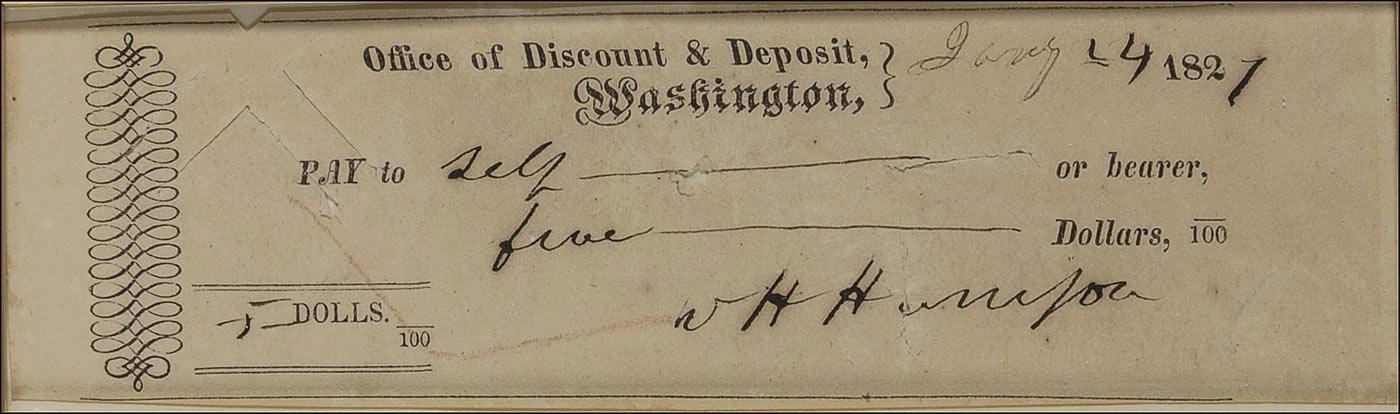Scarce Office of Discount and Deposit check, 7 x 2, filled out and signed by Harrison, “W. H. Harrison,” payable to Self for $5.00, January 24, 1827. In very good condition, with small vertical tear through a single letter of signature, a couple other small tears and holes, cancellation cut to top left, light red pencil cancellation, and a uniform shade of toning. Presidents’ checks are highly collectible and Harrison is noticeably scarce, making this example from a term in the US Senate very desirable.