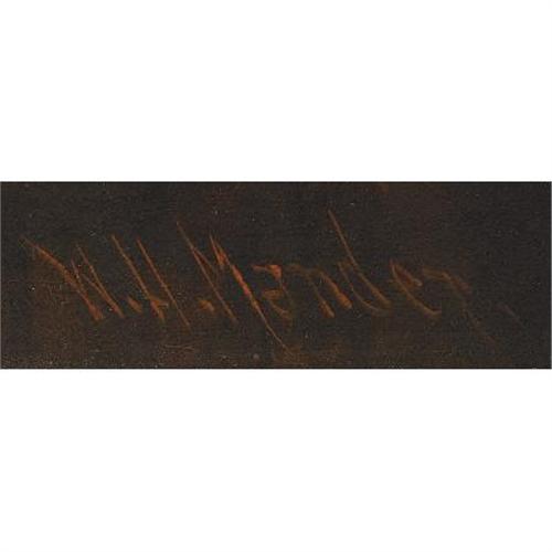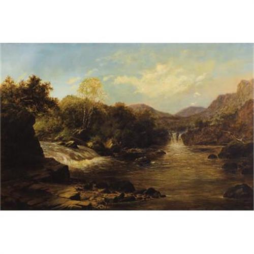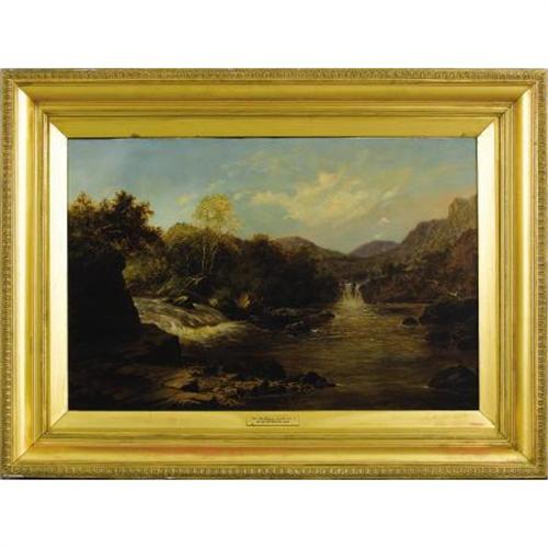 <B>WILLIAM HENRY MANDER (British, 1850-1932)</B></I><BR><I>On the Llugwy, North Wales</B></I><BR>Oil on canvas<BR>24 x 38 inches (61.0 x 96.5 cm)<BR>Signed lower left: <I>W. H. Mander</B></I><BR> <BR>William Henry Mander was a prolific landscapist who painted extensively in Wales. His subjects usually featured waterways and rushing streams, often composed in views that focused upon a confluence. He was active from 1880 until his death, and exhibited his work widely, though never at the Royal Academy.<B>Condition Report:</B> Very good condition, two spots of flaking in cloud. Relined.<BR><BR><b>Shipping:</b> Requires 3rd Party Shipping (<a target="_blank" href="http://www.heritageauctions.com/common/shipping.php">view shipping information</a>)
