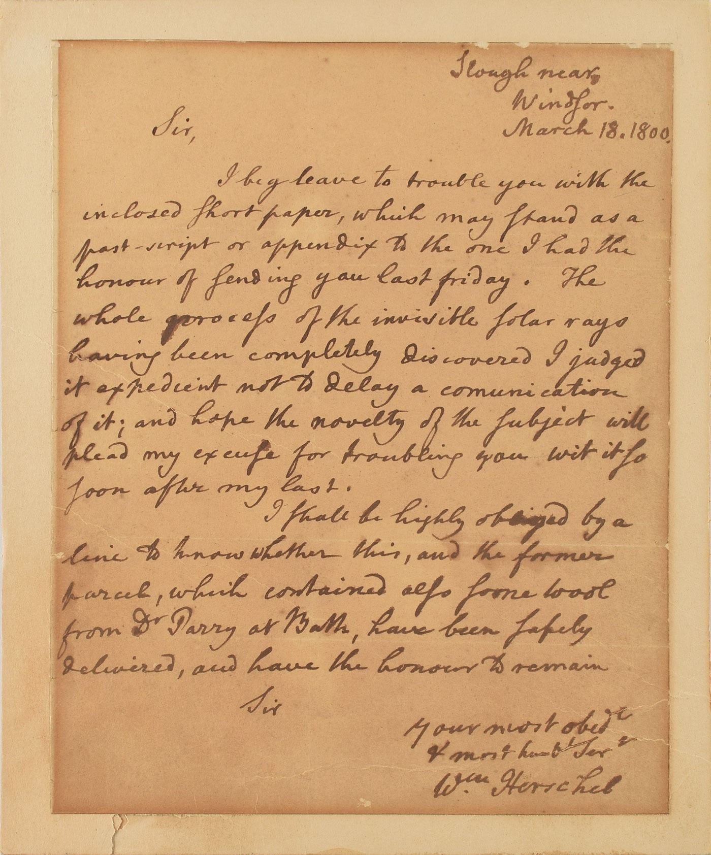 German-British astronomer, composer and brother (1738–1822) of fellow astronomer Caroline Herschel; he discovered Uranus on March 13, 1781, pioneered the use of astronomical spectrophotometry, discovered infrared radiation, and was the first president of the Royal Astronomical Society when it was founded in 1820. Rare ALS signed “Wm. Herschel,” one page, 7 x 8.75, March 18, 1800. Letter written from "Slough near Windsor," in full: "I beg leave to trouble you with the enclosed short paper, which may stand as a post-script or appendix to the one I had the honour of sending you last Friday. The whole process of the invisible solar rays having been completely discovered I judged it expedient not to delay a communication of it; and hope the novelty of the subject will plead my excuse for troubling you with it so soon after my last. I shall be highly obliged by a line to know whether this, and the former parcel, which contained also some wool from Dr. Parry of Bath, have been safely delivered.” Affixed to a slightly larger cardstock mount. In very good to fine condition, with some creasing, a few small edge chips, and moderately heavy overall toning. HerscheI’s discovery of ‘infra-red’ solar rays assured his place in history as a physicist as well as an astronomer. Before 1800, when he presented his theories on the laws of the reflection, refraction, and transmission of radiant heat to the Royal Society, no one had suspected such variations within the spectrum. Herschel's studies also dealt with the question of the chemical properties of prismatic colors.