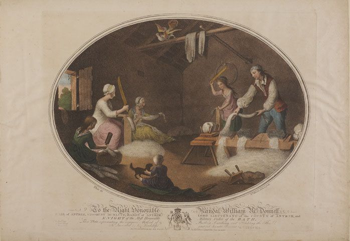 Born in Waterford, Hincks was self taught as an artist, and exhibited at the Society of Artists, Dublin, in the 1780s, as well as at the RA, London. The present series depicts the progress of the Linen Industry in Northern Ireland in all its different stages from sowing the seed to the arrival of the webs at the Linen Hall.
