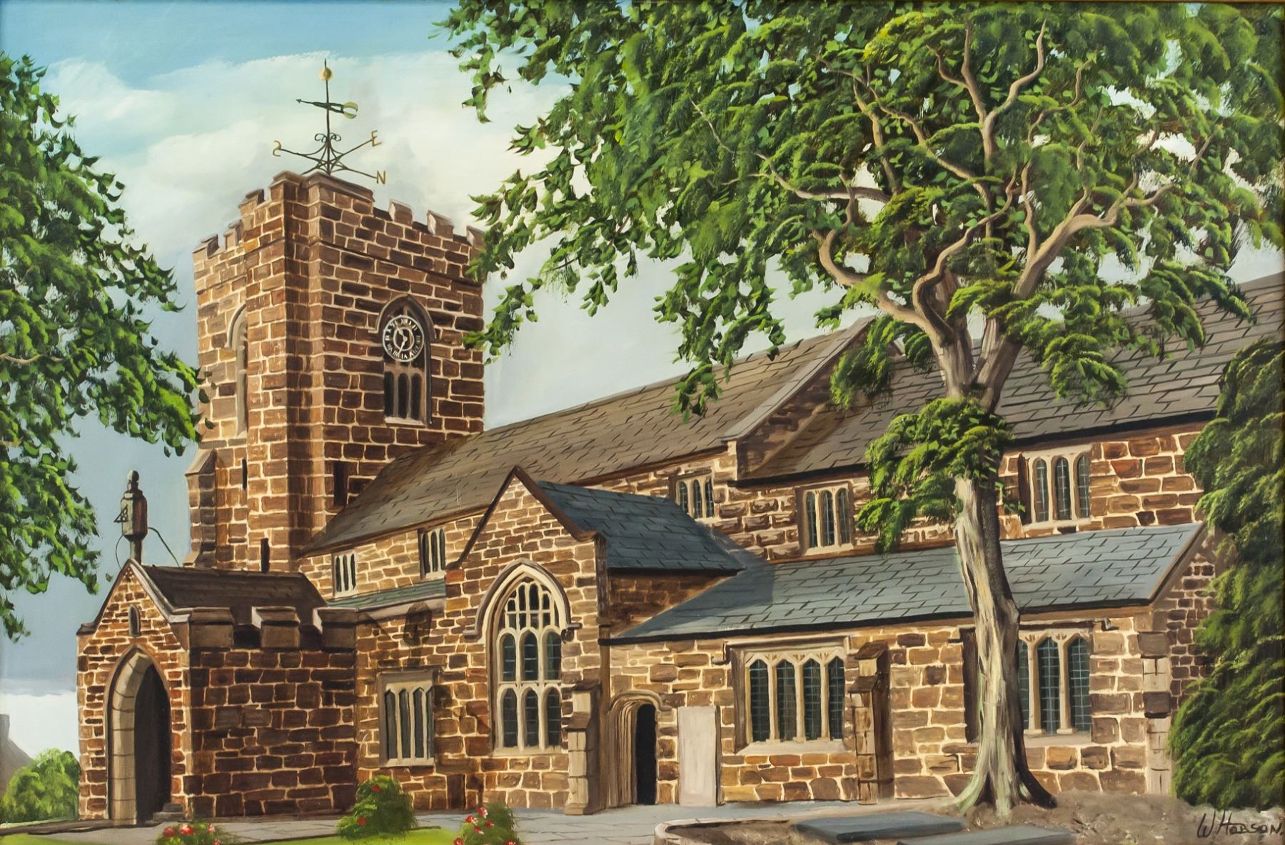 Oil on board, framed. Featuring landscape scene of a brick building, possibly a church. Signed W Hobson in lower right corner. Early 20th century. 49 x 74.5 cm (19 x 29 in), Frame: 57 x 83 cm (22.5 x 32.5 in). Provenance: This lot carries limited provenance from a Hamilton estate