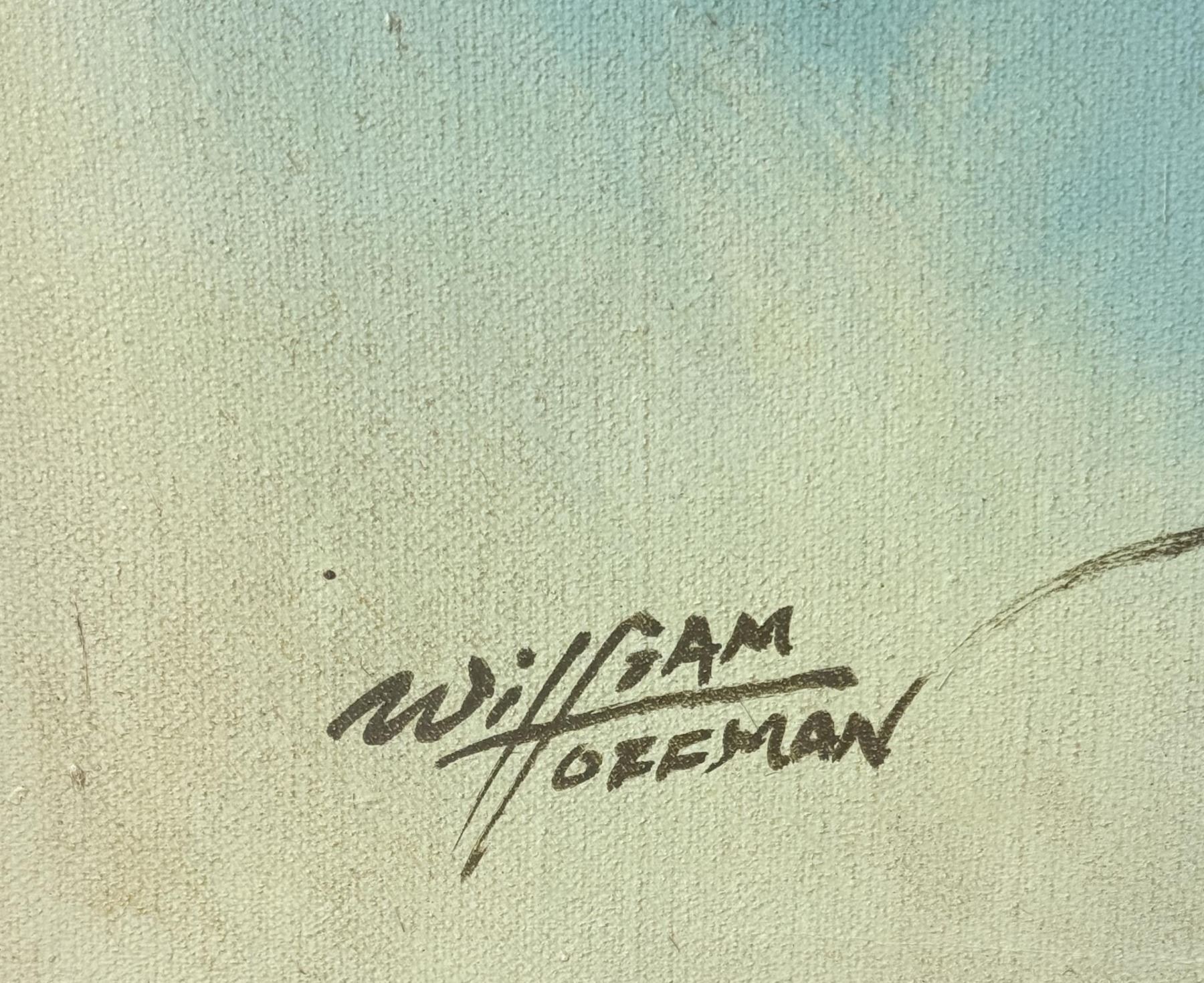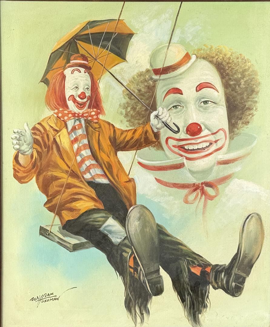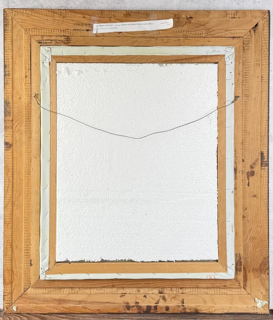 Title is Clown. 20" by 24" unframed. 28" by 32" framed. Oil on Canvas. William Hoffman (1924 - 1995) was active/lived in Montana, California. William Hoffman is known for Western genre, seascape, landscape. Raised in Montana, Bill Hoffman worked cattle ranches throughout the state. Following high school, he thought he might settle down on a ranch near Choteau, but the Marine Corps had other ideas, which included island hopping in the Pacific for three days during WWII. After the war, Bill enjoyed life, wandering through three colleges. The various curricula included three majors and two minors, but never an art course. To this day, he remains completely self-taught. In 1964, as regional manager for ASCAP, Bill attended a convention in San Francisco and somehow bumbled into an art gallery. "I'd never seen one before, and I was stunned to learn that artists didn't necessarily always starve." Starting out initially, Bill tried painting seascapes. Later, Bill took one of these seascapes to a Los Angeles dealer, who offered him a contract for everything he painted, sight unseen. After ten years, he had 22 paintings in print and an international reputation. In 1974, Bill visited his brother's cattle ranch in Montana, then and there it occurred to him that what he really wanted to do was western art.