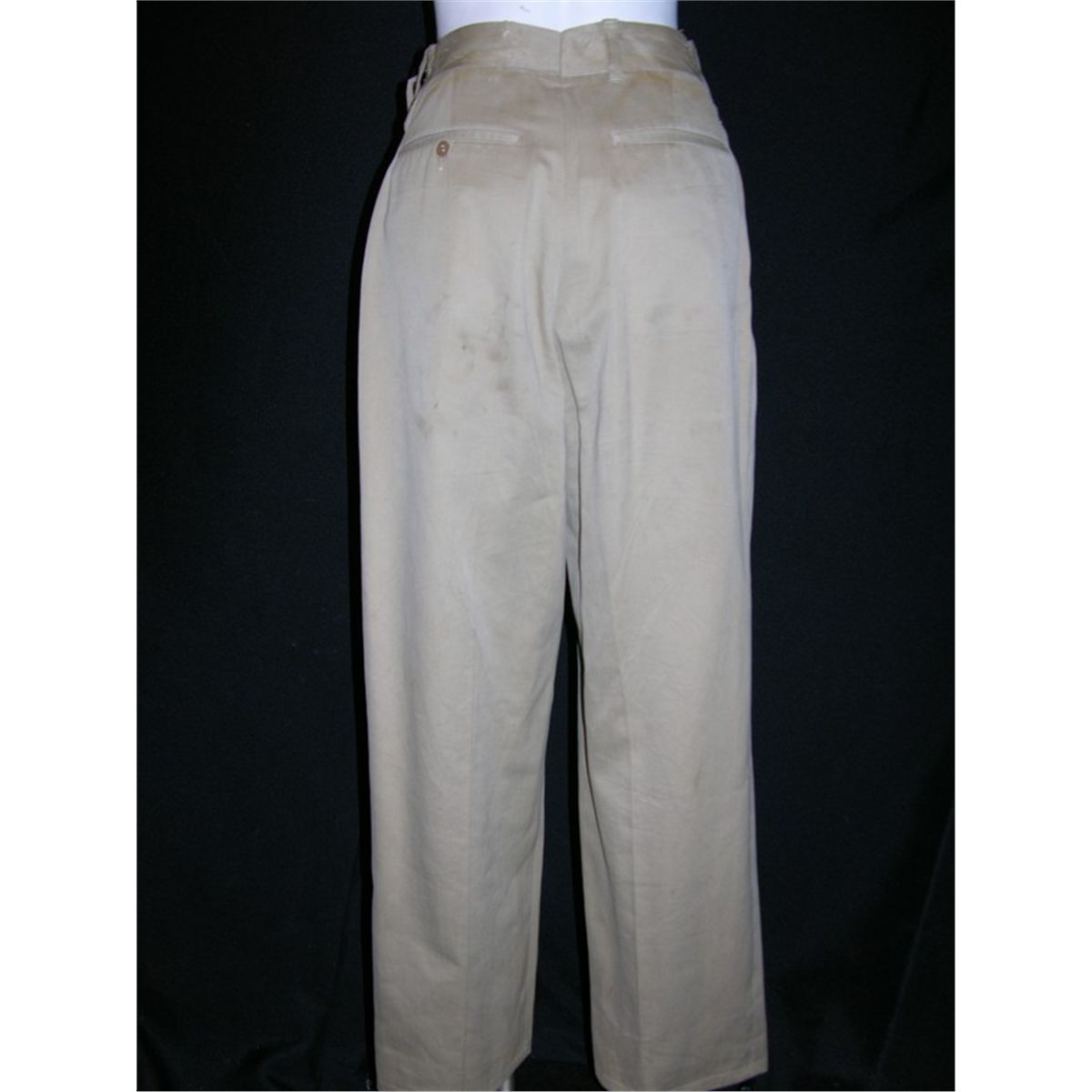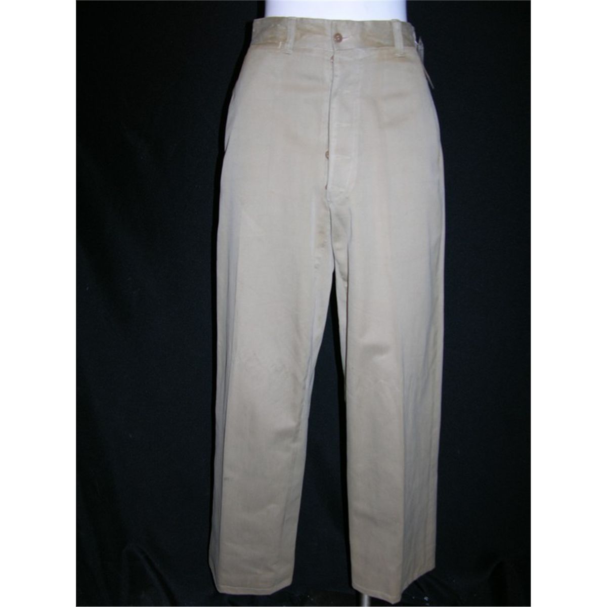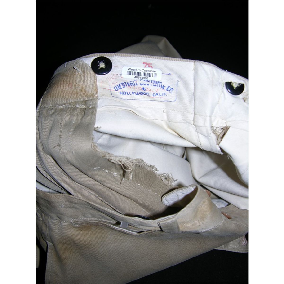 Tan military pants worn by star William Holden as Lt. Cmdr. Ken White in Submarine Command (1951). The film detailed the troubled life of a naval officer at the later stages of World War II and the beginning of America's conflict with Korean Communists. Includes a Western Costume Company label on the inner waist with Holden's name (as Bill Holden) typewritten on it.