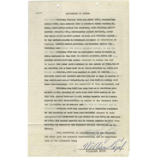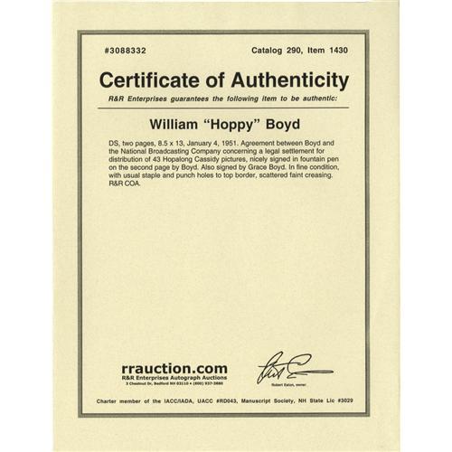 <B>William "Hoppy" Boyd Signed Contract.</B></I> A two-page agreement between the actor and the National Broadcasting Company, dated January 4, 1951, concerning a legal settlement for distribution of 43 Hopalong Cassidy movies, signed by Boyd in black fountain ink. In Very Fine condition with the usual staple and punch holes to the top edge and some very mild creasing and tanning.<BR><BR><b>Shipping:</b> Flat Material, Small (<a target="_blank" href="http://www.heritageauctions.com/common/shipping.php">view shipping information</a>)