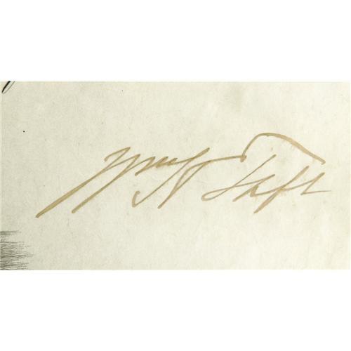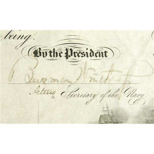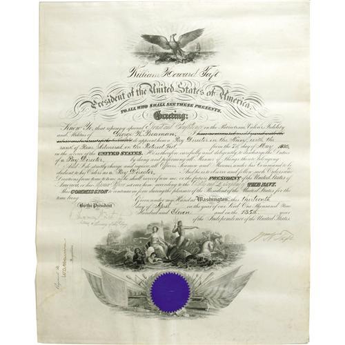 <B>William Howard Taft Document Signed,</B></I> "<I>Wm H Taft</B></I>", one page, partially printed, vellum, 15.5" x 19.5", Washington, D.C., April 13, 1911. George Beaman is named a Rear Admiral on the Retired List. Appropriate eagle, patriotic and maritime vignettes with a blue seal affixed. Very fine condition. This U.S. Navy commission was a formality since it merely acknowledges Beaman's position already held for a dozen years. George Beaman was a Civil War veteran and carer officer. His last active posting was as Paymaster for the Boston Navy Yard.<BR><BR><b>Shipping:</b> Flat Material, Large (<a target="_blank" href="http://www.heritageauctions.com/common/shipping.php">view shipping information</a>)