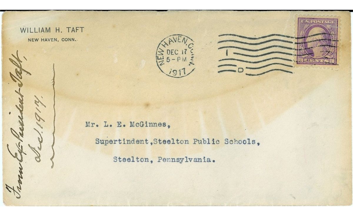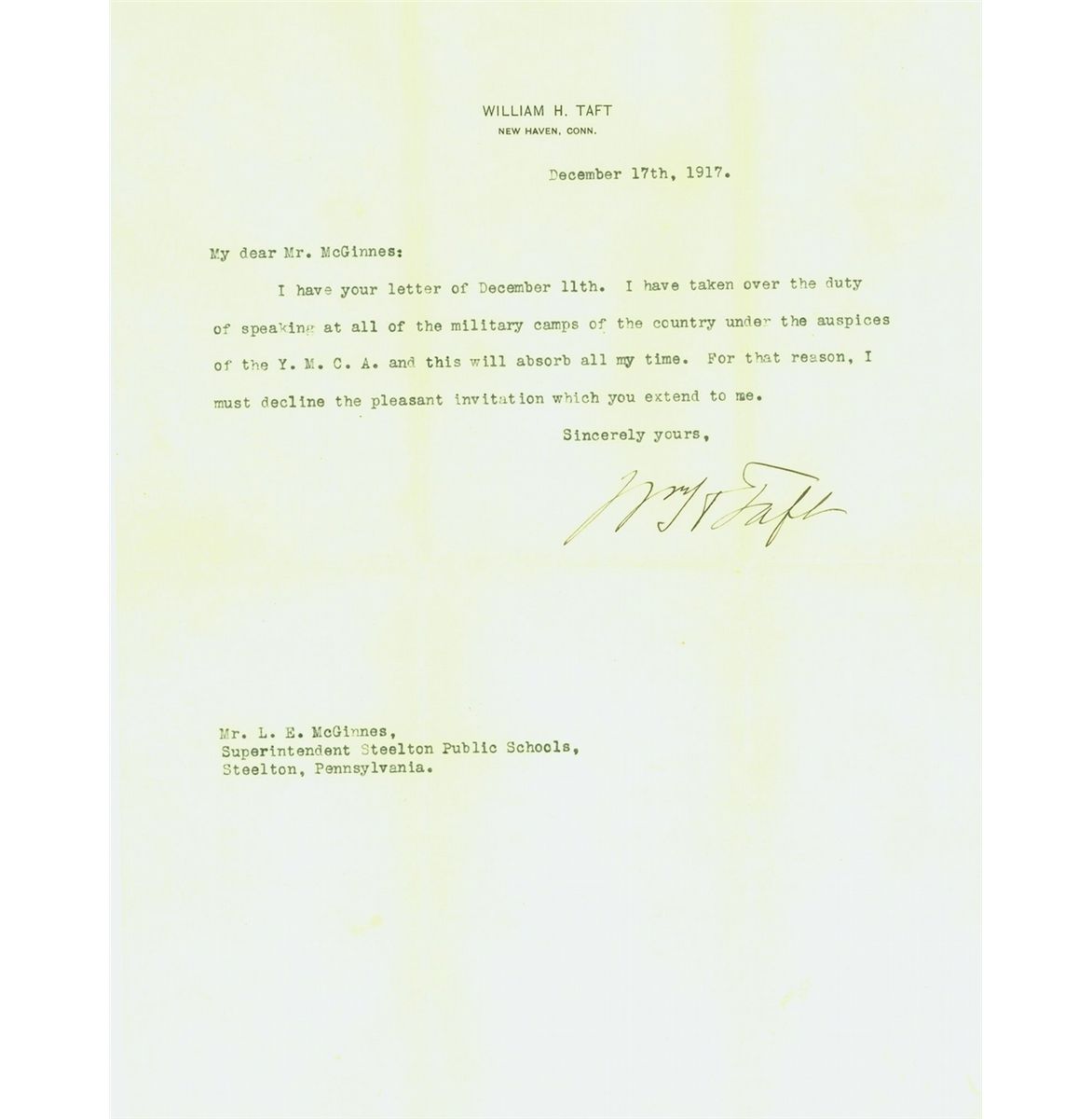 TLS dated December 17, 1917, from Taft declining an invitation too speak , due to the fact that he has already taken on the duty to speaking to all of the military camps of the Y.M.C.A. Letter in good condition with accompanying envelope.