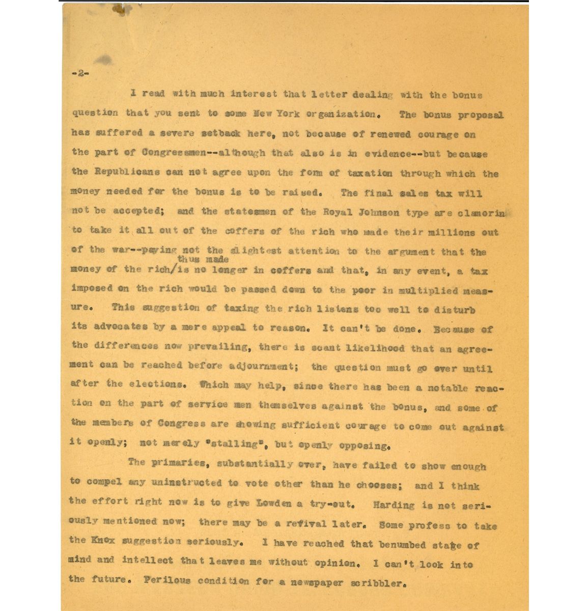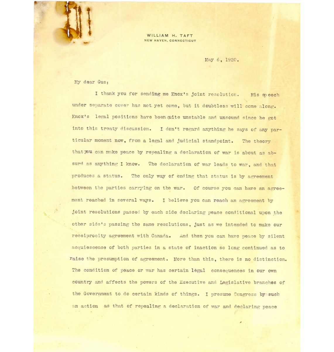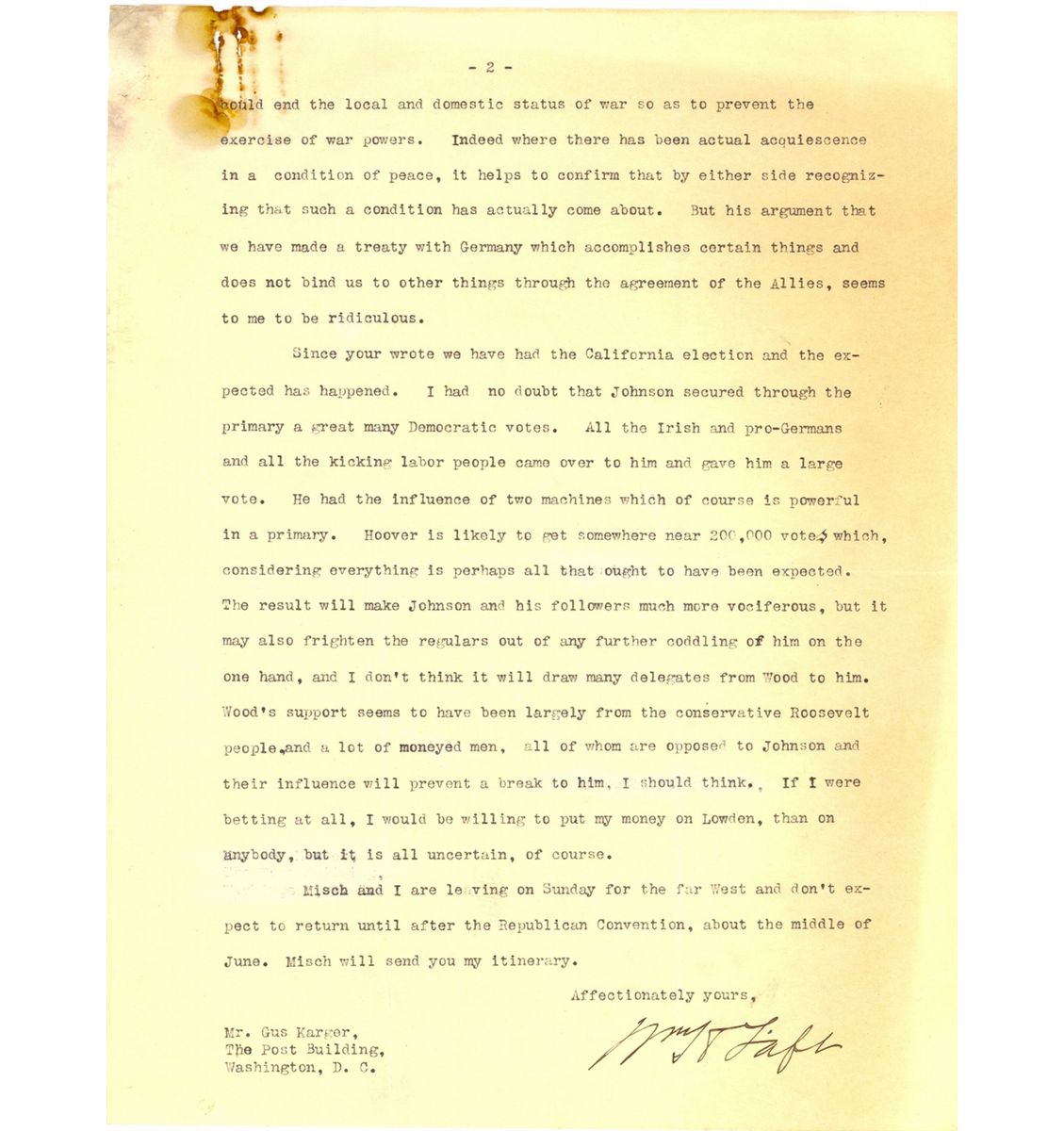 TLS signed •Wm. H. Taft," two pages, 8 x 10.5, personal letterhead, May 6, 1920. Letter to newspaper correspondent Gus Karger. In part: