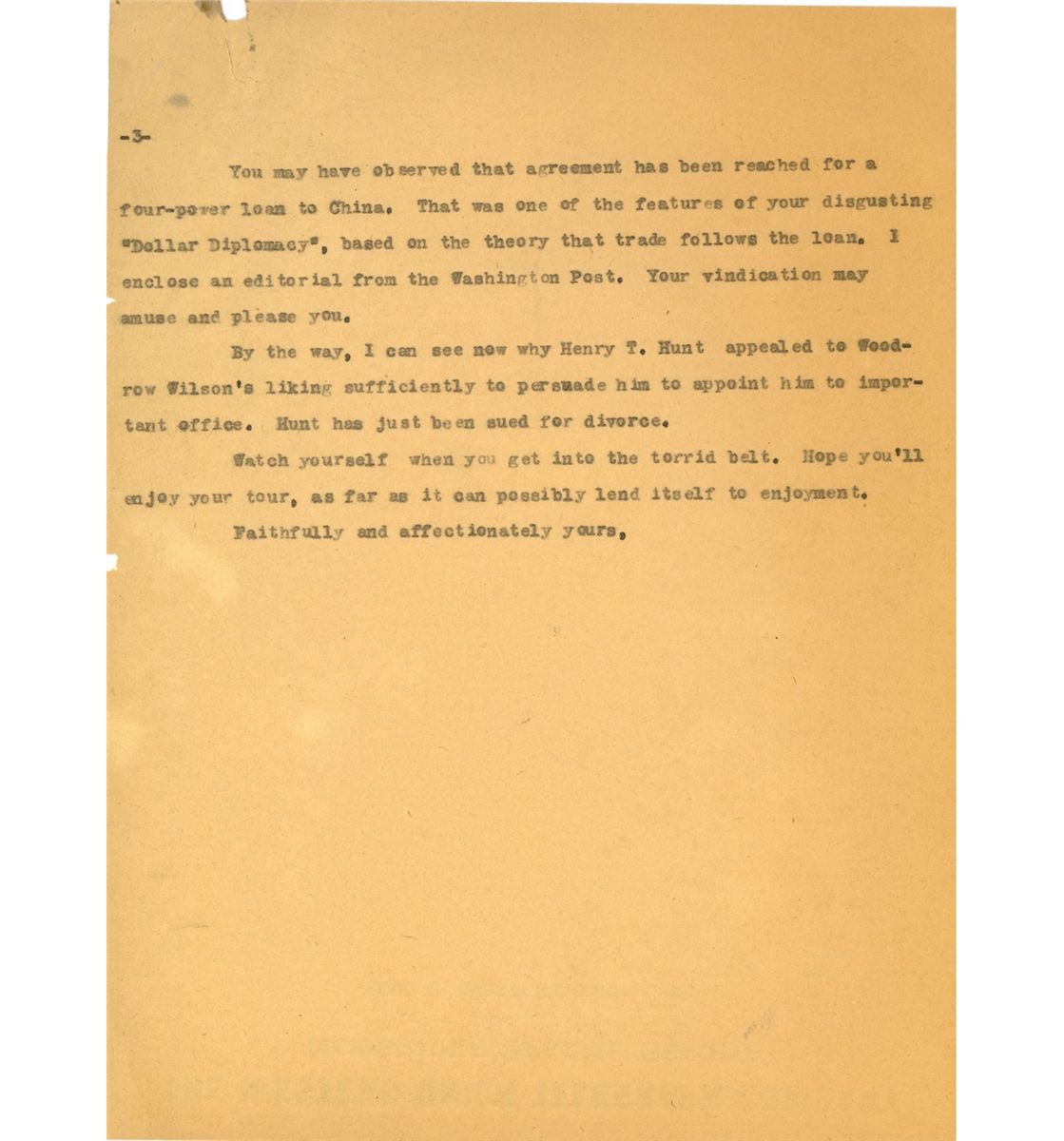 "Thank you for sending me Knox's joint resolution ... Knox's legal positions have become quite unstable and unsound since he got into this treaty discussion. I don't regard anything he says of any particular moment now, from a legal and judicial standpoint. The theory that you can make peace by repealing a declaration of war is about as absurd as anything I know. The declaration of war leads to war, and that produces a status. The only way of ending that status is by agreement between the parties carrying on the war." A carbon copy of Karger's three-page response is attached with a paperclip. Intersecting folds, toning, and stains and rusty paperclips to upper left corner, otherwise fine condition.