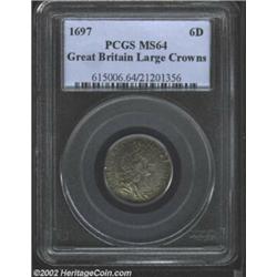 William III Sixpence 1697 Large crowns, KM496.1, MS64 PCGS. A lovely coin with an excellent strike and beautiful toning. Important notice: We expect to be auctioning lots at the rate of 200-250 per hour. Sometimes eBay Premier live bid software cannot keep up with that pace, so we strongly recommend that you place a realistic proxy bid now as insurance to avoid disappointment. Also please note that all Heritage/CAA lots purchased through eBay Premier carry a 20% Buyer's Premium. Please make sure you read the Terms and Conditions.