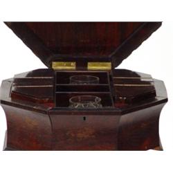 William IV rosewood teapoy, the octagonal top with moulded edge, opening to reveal four tea canisters, supported on a circular carved pedestal with trefoil platform and scrolling feet