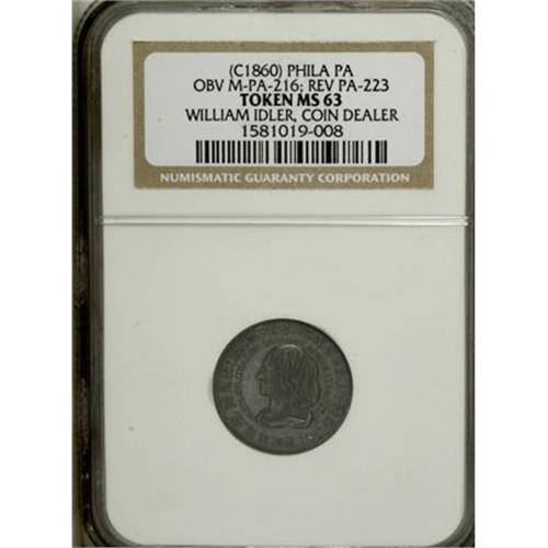 <B>(Circa 1860) William Idler, Philadelphia, PA, MS63 NGC.</B></I> Silver, 20 mm. Obverse of Miller-Pa-223, reverse of Miller-Pa-216. This die pair is unlisted in Rulau since he classifies it as a struck copy of a Colonial coin (Maryland penny), despite the additional legend "W. Idler, Dealer in Coins, Minerals, Etc. Phila." Semi-prooflike and toned in blended aqua and chestnut.<BR><BR><b>Shipping:</b> Coins & Currency (<a target="_blank" href="http://www.heritageauctions.com/common/shipping.php">view shipping information</a>)