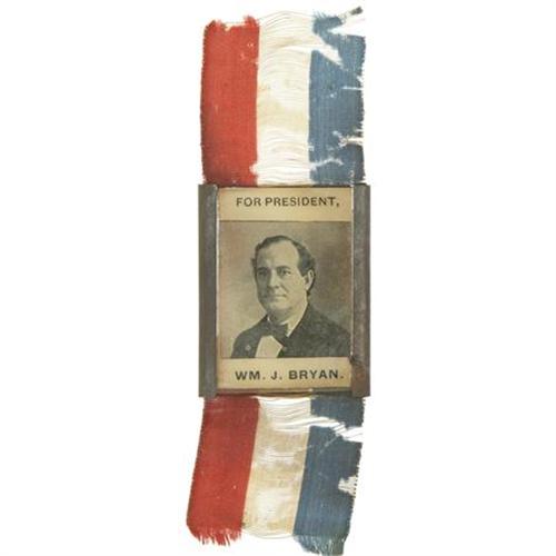 <B>William J. Bryan Campaign Ribbon.</B></I> 1.5" x 2" black and white portrait clipped to 1.5" x 4.75" red, white, and blue silk ribbon. In good condition with some fraying on ribbon. <I>From the Norman Loewenstern Collection.</B></I><BR><BR><b>Shipping:</b> Flat Material, Small (<a target="_blank" href="http://www.heritageauctions.com/common/shipping.php">view shipping information</a>)