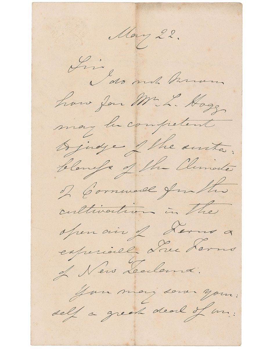 English botanist and botanical illustrator (1785–1865). ALS signed “W. J. Hooker,” three pages on two adjoining sheets, 4.5 x 7, May 22. In part: “I do not know how…Mr. L. Hogg may be competent to judge…the Climate of Cornwall for the cultivation in the open air of Ferns & especially Tree Ferns of New Zealand. You may save yourself a great deal of unnecessary trouble, if instead of attempting to revive seeds from spores, you procure healthy young stems at some respectable Nursery & test the matter at once.” Central horizontal and vertical folds, and some scattered light toning and soiling, otherwise fine condition.