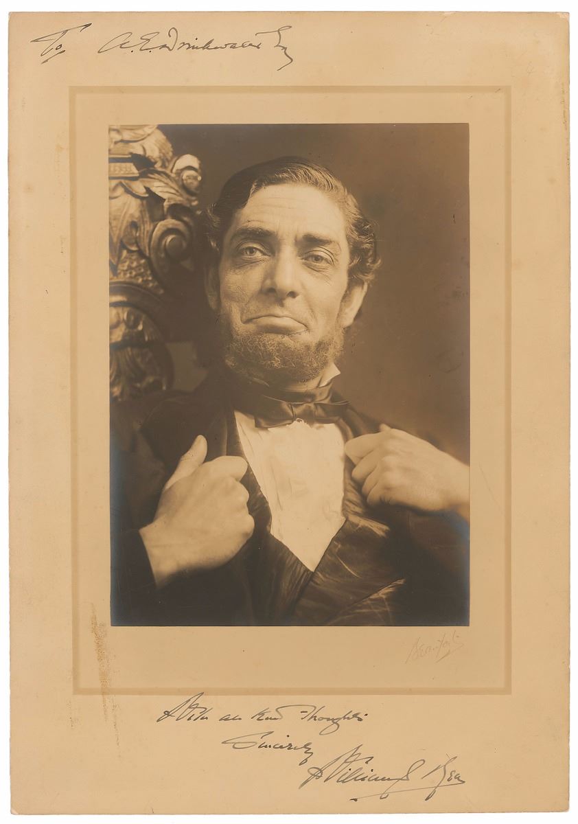 Irish actor who appeared in productions of John Drinkwater’s Abraham Lincoln in England in 1918 and 1919. Crystal-clear matte-finish 8 x 11.5 photo of Rea in his role as Abraham Lincoln, signed and inscribed in the borders in fountain pen, “To A. E. Drinkwater, With all kind thoughts, Sincerely, William J. Rea.” Affixed to a same-size mount. Toned adhesive remnants to lower left and a bit of silvering to dark areas of the image, otherwise fine condition. This was most likely inscribed to a family member of the playwright.