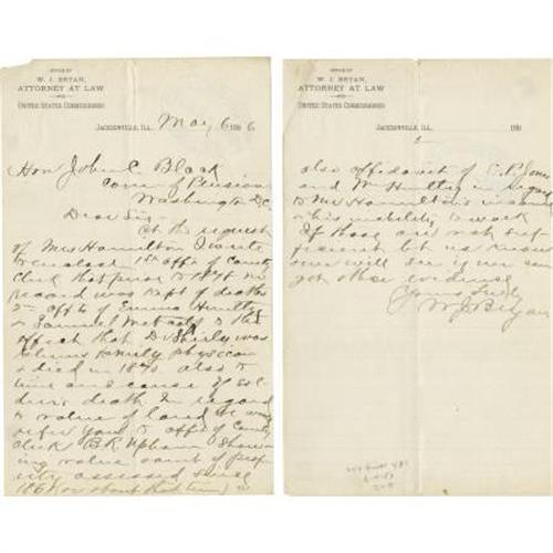 <B>William Jennings Bryan Autograph Letter Signed,</B></I> 5.75” x 9.5”, two pages, on W. J. Bryan Attorney At Law stationary, May 6, 1885, Jacksonville, Illinois. Folds and creases with minor edge staining, else near fine. <I>Ex. Henry E. Luhrs Collection.</B></I> <BR><BR><b>Shipping:</b> Flat Material, Small (<a target="_blank" href="http://www.heritageauctions.com/common/shipping.php">view shipping information</a>)