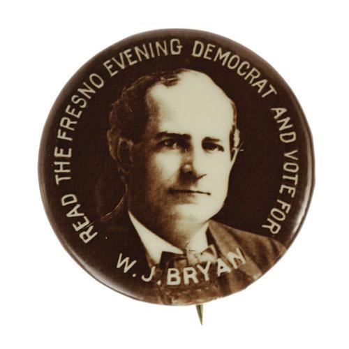 <B>Great 1900 William Jennings Bryan Button, with Fresno, California Newspaper Advertising.</B></I> Campaign buttons of this era which also carry advertising are collector favorites, and especially prized are those advertising newspapers. We have never had this variety before, and it is especially nice as it adds the exhortation to "Vote For Bryan", rather than just bearing the newspapers name. Choice condition. <I>From the Norman Loewenstern Collection.</B></I>