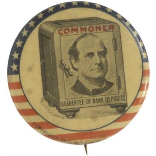 <B>William Jennings Bryan Campaign Button,</B></I> photo on safe door with “Commoner” above and “Guarantee of Bank Deposits” below. The button is 1 ¼” with full backpaper. Spotted and off center, else very good.<BR><BR><b>Shipping:</b> Miscellaneous Collectibles, Smal (<a target="_blank" href="http://www.heritageauctions.com/common/shipping.php">view shipping information</a>)