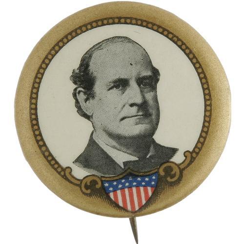 <B>William Jennings Bryan Celluloid Campaign Button,</B></I> 1 1/4", photo of Bryan above a red, white and blue shield on a gold background. Excellent condition.<BR><BR><b>Shipping:</b> Miscellaneous Collectibles, Smal (<a target="_blank" href="http://www.heritageauctions.com/common/shipping.php">view shipping information</a>)