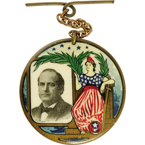 <B>William Jennings Bryan: A Dazzling 1¾" Multicolor Celluloid From the 1908 Campaign.</B></I> Many consider the elaborate multicolor artwork from this election to be the high watermark in political button design. Even in such exalted company, this variety stands out. The present example is made as a button with metal collet, but is neatly holed at the top, as manufactured, for wear as a watch fob. The colors are incredibly vibrant and the condition very choice.<BR><BR><b>Shipping:</b> Small Flat (<a target="_blank" href="http://www.heritageauctions.com/common/shipping.php">view shipping information</a>)