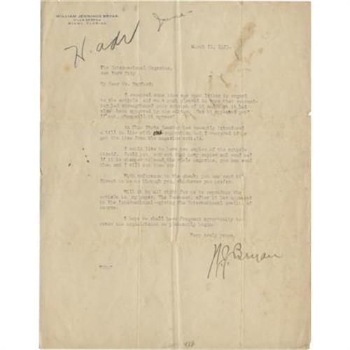 <B>William Jennings Bryan Typed Letter Signed,</B></I> 8.5 x 11, on personal stationary, March 21, 1923, Miami, Florida. Stained and folded, else near fine. <BR><BR><b>Shipping:</b> Flat Material, Small (<a target="_blank" href="http://www.heritageauctions.com/common/shipping.php">view shipping information</a>)