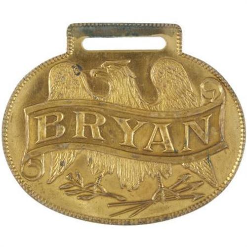 <B>William Jennings Bryan Watch Fob.</B></I> This 1 5/8" wide watch fob is a seldom seen variety. This watch fob depicts "<I>BRYAN" </B></I>over an iconic heraldic Bald Eagle.<BR><BR><b>Shipping:</b> Miscellaneous Collectibles, Smal (<a target="_blank" href="http://www.heritageauctions.com/common/shipping.php">view shipping information</a>)