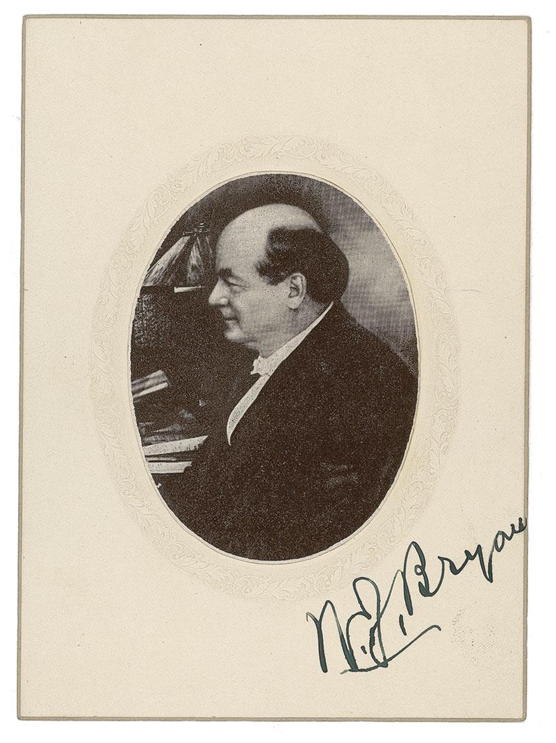 Unusual oval profile portrait surrounded by embossed leaves on a 3.75 x 5.25 mount, boldly signed “W. J. Bryan” in fountain pen on the mount. In fine condition. An unusual and decorative image. Provenance: The Barry Hoffman Collection.