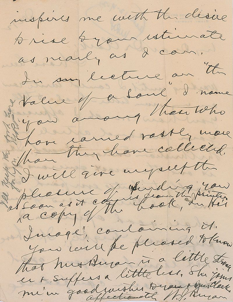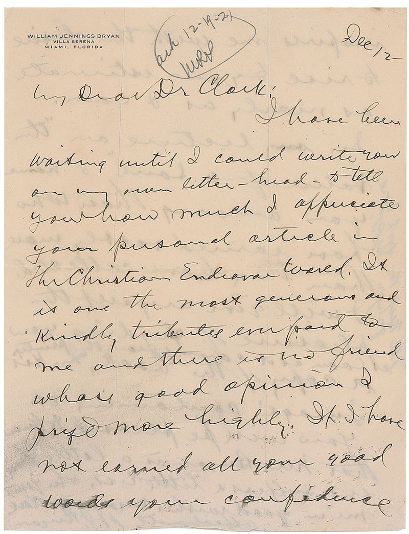 ALS signed “W. J. Bryan,” one page both sides, 8.5 x 11, personal letterhead, December 12, 1921. Letter to Francis Edward Clark. In part: “I appreciate your personal article in The Christian Endeavor World. It is one [of] the most generous and kindly tributes…there is no friend whose good opinion I prize more highly…In my lecture ‘The Value of a Soul’ I name you among those who have earned vastly more than they have collected.” In fine condition, with intersecting folds and brushes to a few words.