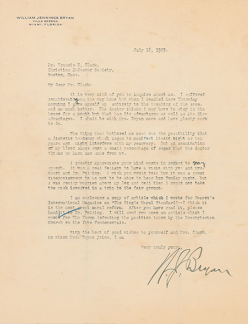 TLS signed “W. J. Bryan,” one page, 8.5 x 11, personal letterhead, July 16, 1923. Letter to Francis Edward Clark. In part: “The doctor thinks I may have to stay in the house for a month…a diabetic tendency which began to manifest itself eight or ten years ago might interfere with my recovery. But an examination of my blood shows such a small percentage of sugar that the doctor thinks no harm could come from it…I wrote for Hearst’s International Magazine on ‘The Single Moral Standard’—I think it is the next great moral reform.” Intersecting folds (one vertical fold passing through a single letter of the signature), and light scattered toning from mounting remnants to reverse, otherwise fine condition.