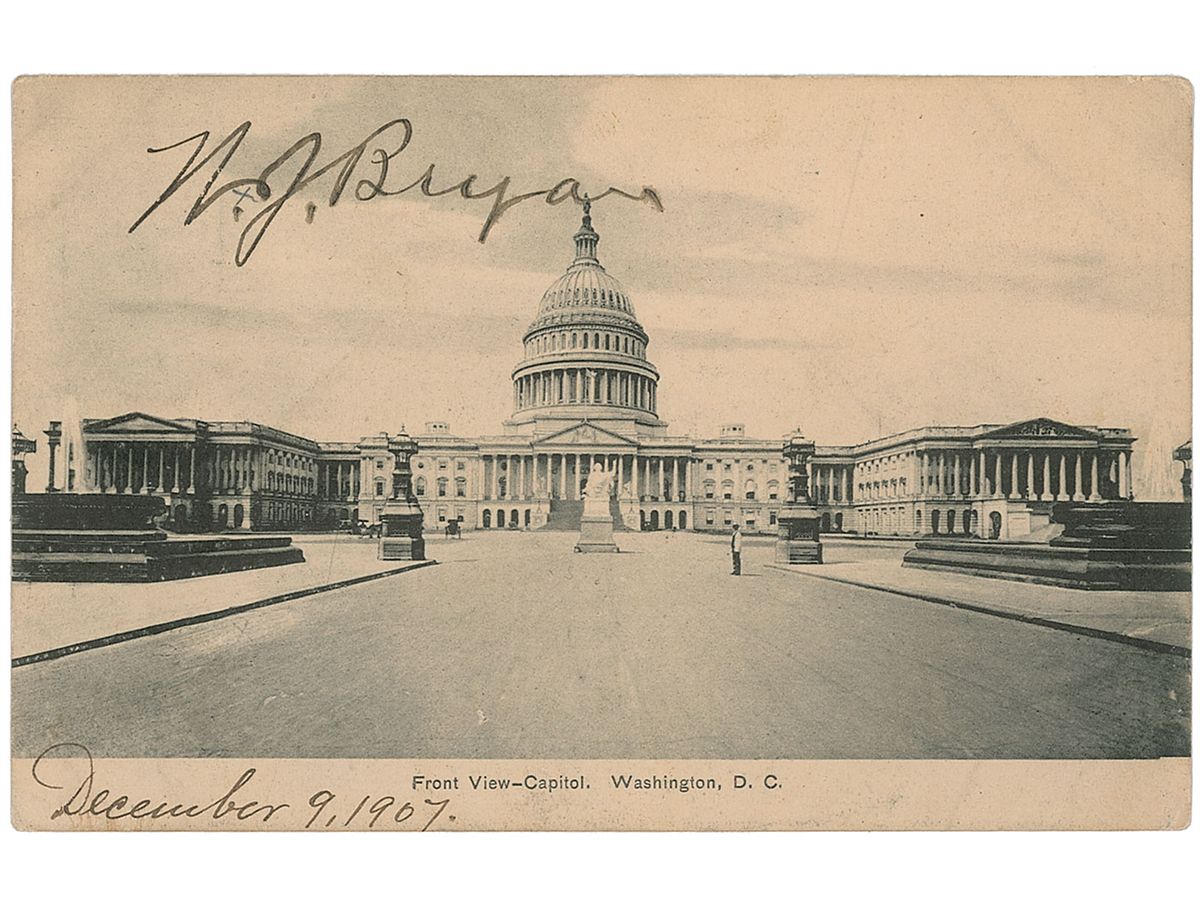 Attractive postcard of a front view of the Capitol building in Washington, DC, 3.5 x 5.5, boldly signed in black ink, “W. J. Bryan.” Collector’s notation to the lower border indicates that it was received on December 9, 1907. In fine condition.