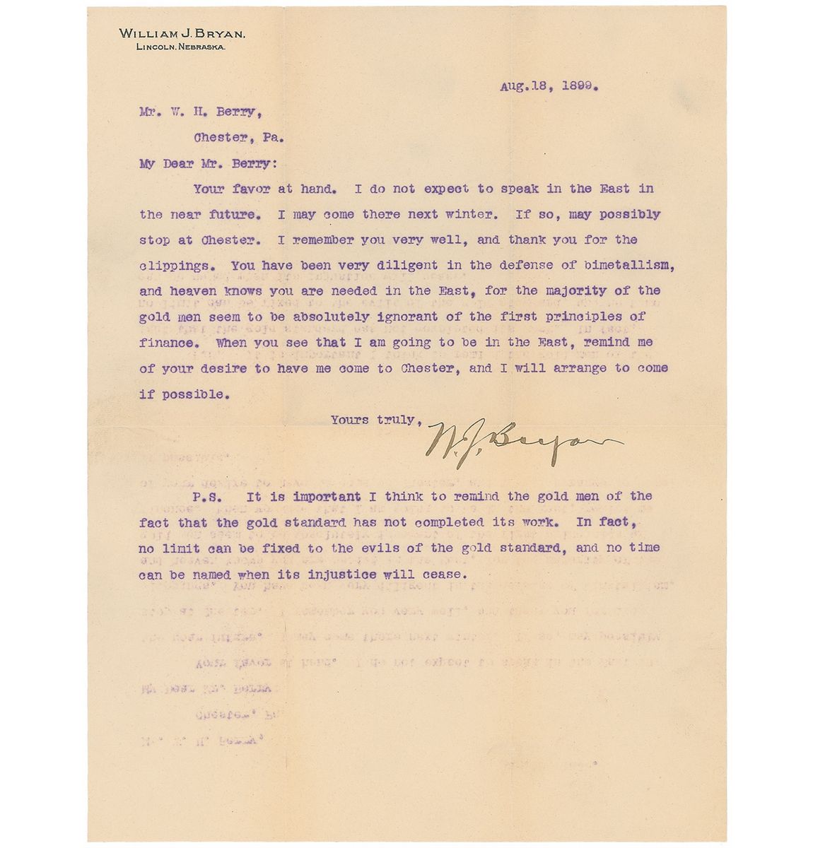 TLS signed “W. J. Bryan,” one page, 8.25 x 10.75, personal letterhead, August 18, 1899. Letter to W. H. Berry, in part: “I do not expect to speak in the East in the near future. I may come there next winter. If so, may possibly stop at Chester. I remember you very well, and thank you for the clippings. You have been very diligent in the defense of bimetallism, and heaven knows you are needed in the East, for the majority of the gold men seem to be absolutely ignorant of the first principles of finance.” Bryan then adds a lengthy postscript, in full: “It is important I think to remind the gold man of the fact that the gold standard has not completed its work. In fact, no limit can be fixed to the evils of the gold standard, and no time can be named when its injustice will cease.” In fine condition, with intersecting folds (two passing through small portions of the signature), and slight mirroring of text.