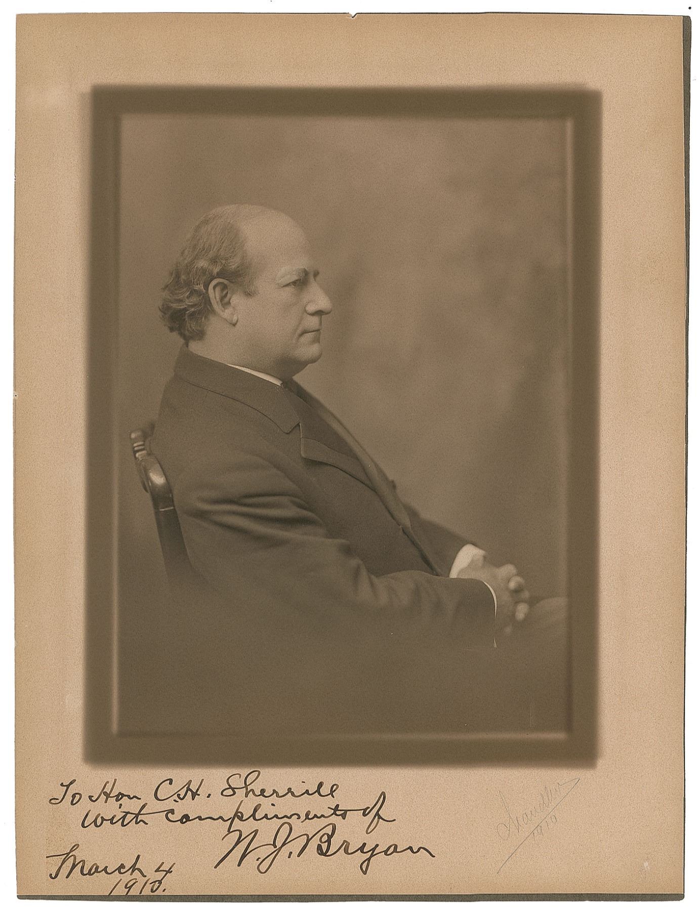 Vintage matte-finish 9 x 12 half-length photo of William Jennings Bryan seated in profile, signed and inscribed in fountain pen, "To Hon. C. H. Sherrill, with compliments of, W. J. Bryan, March 4, 1910.” Signed in the lower right by the photographer, "Chandler, 1910." In fine condition.