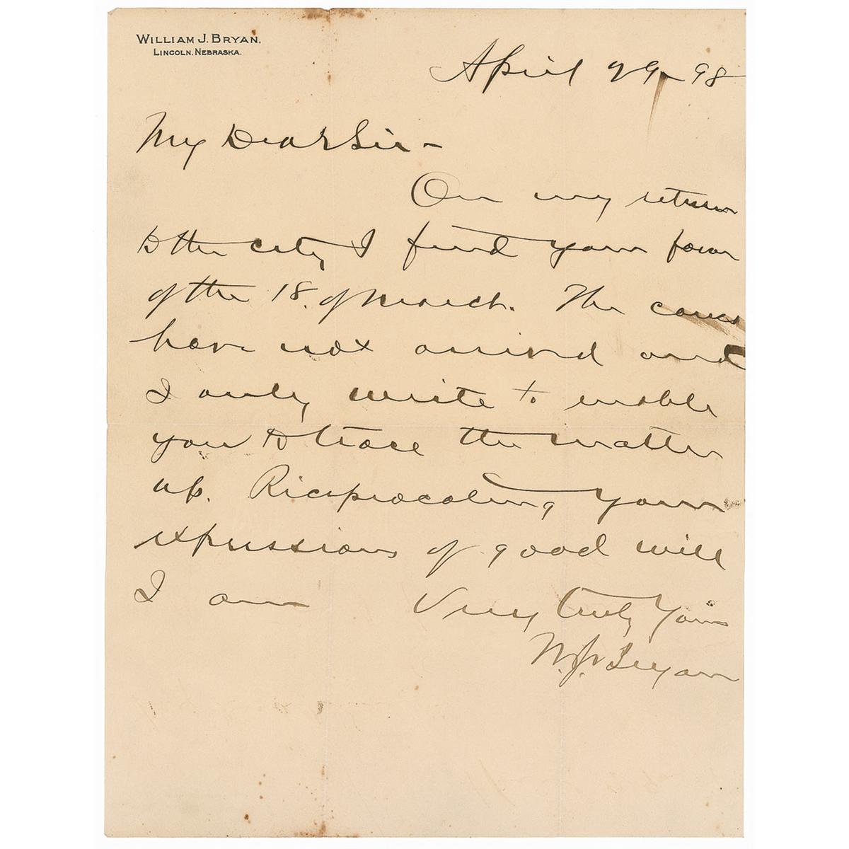 American politician (1860–1925), three-time presidential candidate, secretary of state under Woodrow Wilson, and one of the attorneys in the 1925 Scopes Trial. ALS signed “W. J. Bryan,” one page, 8.5 x 11, personal letterhead, April 29, 1898. Bryan responds to an earlier letter. In full: “On my return to the city I found your favor of the 18 of March. The canes have not arrived and I only write to enable you to trace the matter up. Riciprocating [sic] your expressions of good will.” Scattering toning, soiling along top edge, intersecting folds, and brushes to a few words. Accompanied by the original mailing envelope, otherwise fine condition.