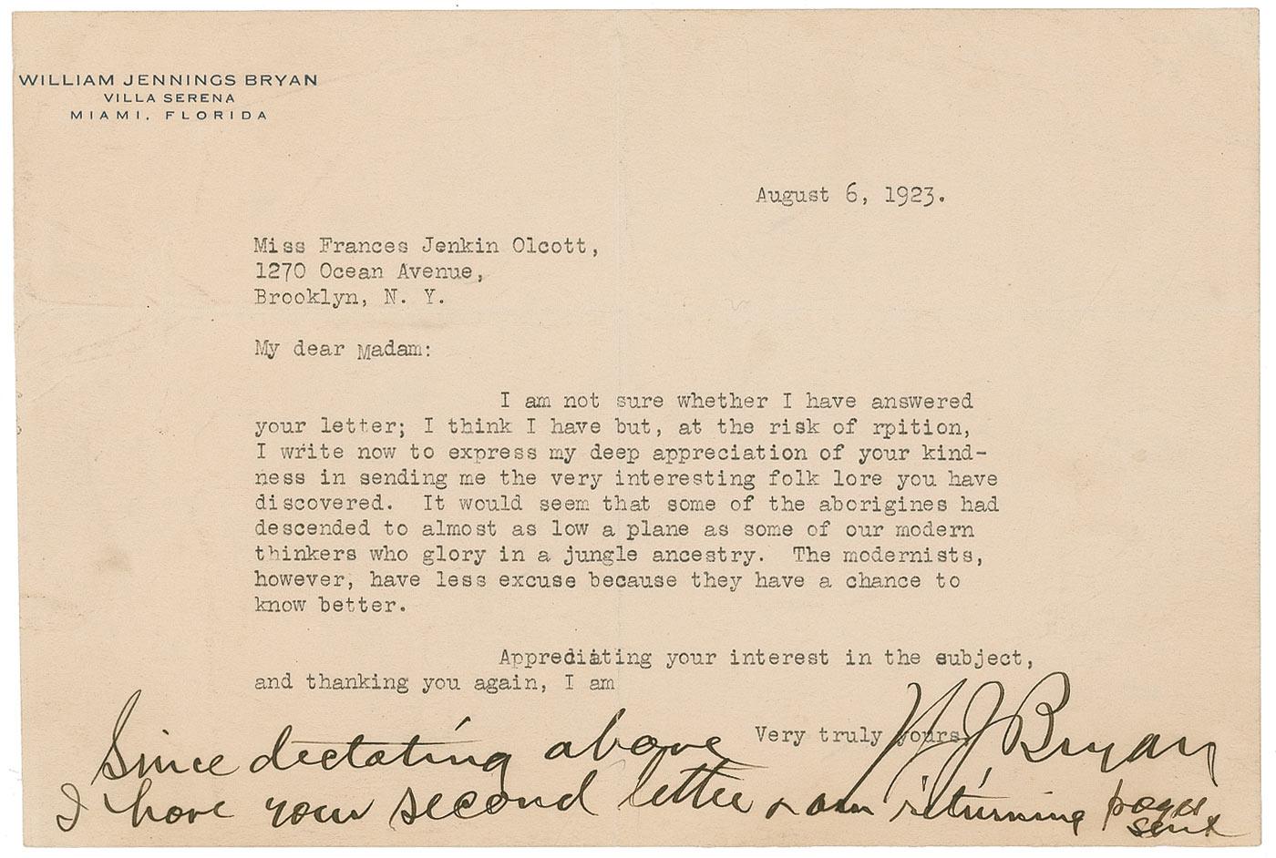 American politician (1860–1925), three-time presidential candidate, secretary of state under Woodrow Wilson, and one of the attorneys in the 1925 Scopes Trial. TLS signed “W. J. Bryan,” one page, 8 x 5.5, personal letterhead, August 6, 1923. Letter to Francis Jenkin Olcott. In full: “I am not sure whether I have answered your letter; I think I have, but at the risk of rpitiion [sic], I write now to express my deep appreciation of your kindness in sending me the very interesting folk lore you have discovered. It would seem that some of the aborigines had descended to almost as low a plane as some of our modern thinkers who glory in a jungle ancestry. The modernists, however, have less excuse because they have a chance to know better.” At the bottom, Bryan adds a short handwritten postscript: “Since dictating above I have your second letter & am returning pages sent.” In very good to fine condition, with edges likely lightly trimmed, intersecting folds, light overall toning, a bit heavier along bottom, and some light creasing and wrinkling.