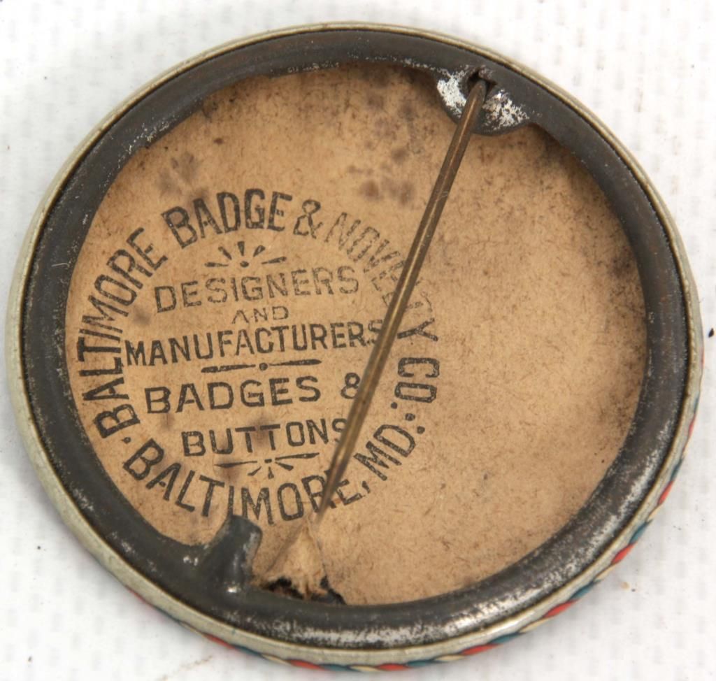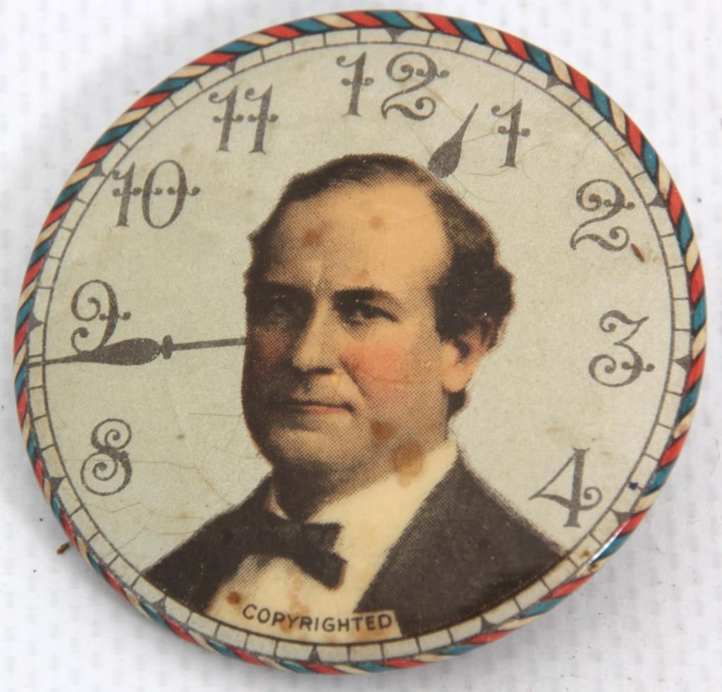 William Jennings Bryant Clock Faced Button. Large campaign button measures 1.75 in. dia. has a portrait of William Jennings Bryant on a silvered background with clock face and red, white & blue banded border; the hands are pointed at 12:44 to indicate the political issues of the time when the silver standard was set at 16-1. In very nice condition with minor crazing to the front; signed on the back Baltimore Badge & Novelty Co. Circa 1896.