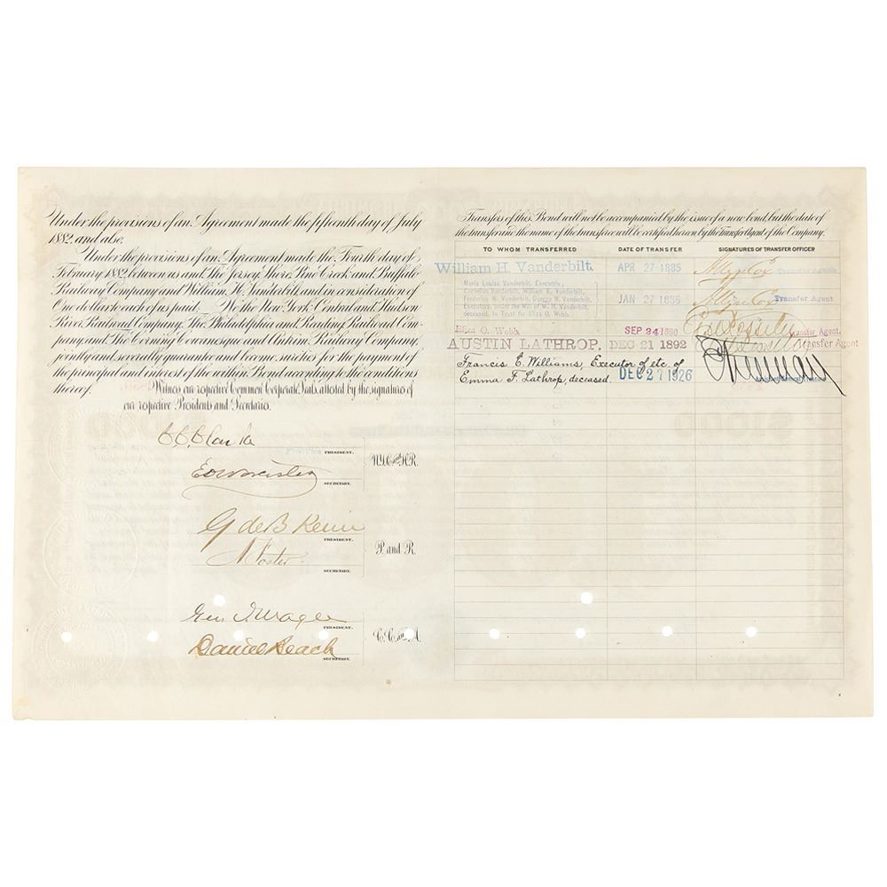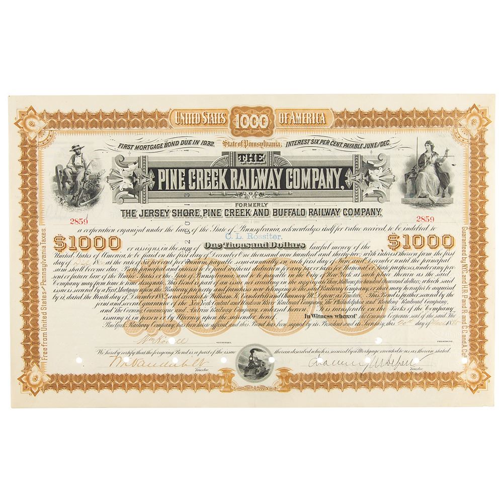Partly-printed DS, one page, 15 x 9.75, March 20, 1885. Pine Creek Railway Company bond for $1000 issued to C. L. Rossiter, signed along the bottom in ink by William Kissam Vanderbilt and Chauncey Depew as trustees. In fine condition.