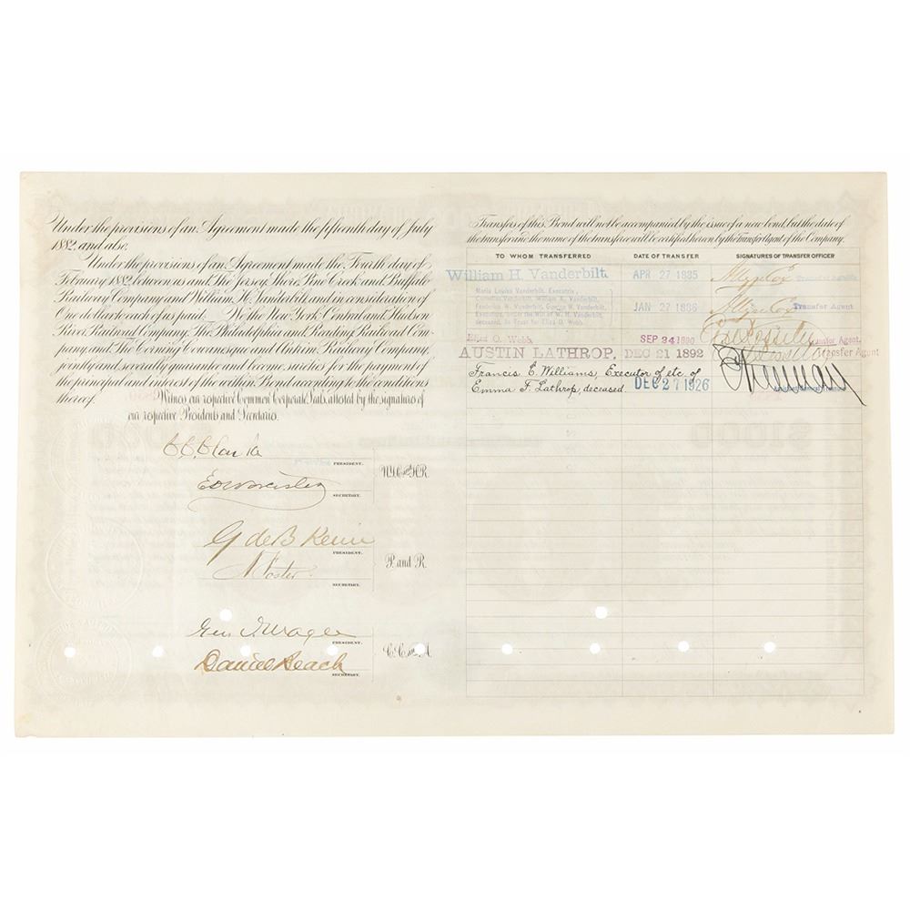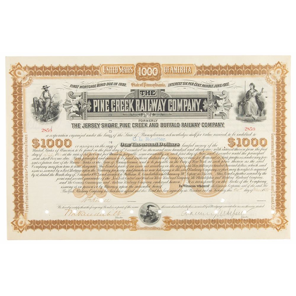 Partly-printed DS, one page, 15 x 9.75, March 20, 1885. Pine Creek Railway Company bond for $1000 issued to C. L. Rossiter, signed along the bottom in ink by William Kissam Vanderbilt and Chauncey Depew as trustees. In fine condition.