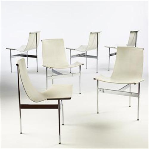 William Katavalos, Ross Littell and Douglas Kelley<BR>T-chairs, set of six<BR>Laverne International<BR>USA, 1952<BR>steel, enameled steel, leather<BR>23 w x 23 d x 31.5 h inches<BR>Literature: <BR><i>Contemporary Furniture</i>, Sembach, pg. 93<BR><BR>Condition of the item is not included in this description. Condition reports are available from Wright upon request. Wright strongly recommends that you review a condition report for each item on which you plan to bid.