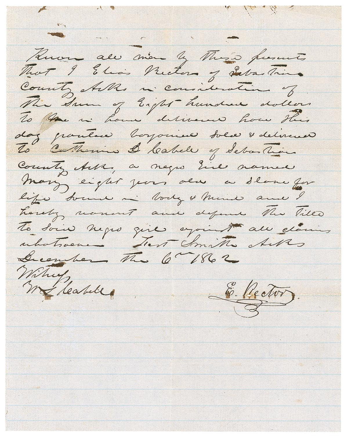 Brigadier General (1827-1911) in the Confederate States Army during the Civil War and later served as Mayor of Dallas, Texas. War-dated ADS, entirely in Cabell’s hand and signed “Witness, W. L. Cabell,” one page, 7 x 9, December 6, 1862, Fort Smith Ark. (near the Indian Territory). A slave bill of sale in which Elias Rector (brother of Arkansas Governor Henry Rector)“in consideration of eight hundred dollars…sld and delivered to Catherine Cabell…a Negro girl named Mary eight years old, a slave for life, sound in body and mind.” Signed at the conclusion by Cabell, and also signed by Rector. In very good condition, with light toning primarily along intersecting folds, trimmed top edge, scattered creasing, and some smudges and mild ink erosion to several words of text.