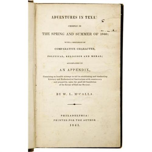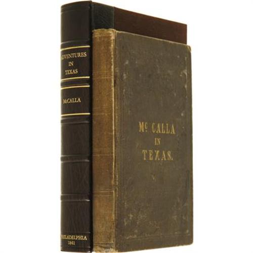 <B>William L. McCalla: </B></I><B><I>Adventures in Texas, Chiefly in the Spring and Summer of 1840;</B></I></B></I><B></B></I><BR> <I>with a Discussion of Comparative Character, Political, Religious and Moral; Accompanied by an Appendix, Containing an Humble Attempt to Aid in Establishing and Conducting Literary and Ecclesiastical Institutions with Consistency and Prosperity, upon the Good Old Foundation of the Favour of God our Saviour. </B></I>Philadelphia: Printed for the Author, 1841. 8 [13]-199 pp. 16mo, original blind-stamped dark brown cloth, title in gilt on front cover. Fine. Housed in a custom clamshell case with five raised bands and gilt title. <BR>McCalla was a controversial Presbyterian clergyman who traveled by sea to Galveston and thence to Houston, Austin, San Antonio and Goliad. The first sixty pages are devoted to an account of this journey and give valuable insight into his character and religious beliefs. The remainder of the book is turned over to his largely favorable views of Texas, particularly its morals and character. <I>From the collection of Darrel Brown.</B></I><BR><B><BR>Reference: </B></I>Streeter 1387: "Account by a Presbyterian minister of a journey by sea to Galveston and then to Houston, Austin, San Antonio and Goliad.... One of the items in the index is the Proposed Charter of Galveston University." <BR><BR><b>Shipping:</b> Books & Catalogs (<a target="_blank" href="http://www.heritageauctions.com/common/shipping.php">view shipping information</a>)