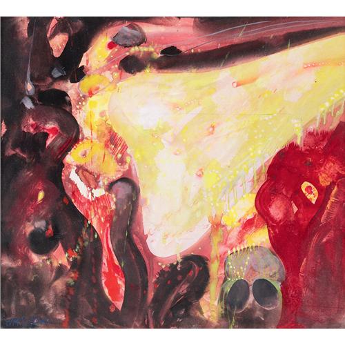 William L. Scharf (American, b. 1927), "A Wing for Leaving the King", c. 1963; watercolor/mixed media, 10.5" x 11.5", signed; titled and dated verso. Philadelphia painter. Scharf exhibited at the Pennsylvania Academy of Fine Art and had a one man exhib