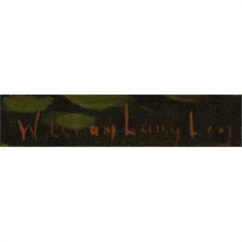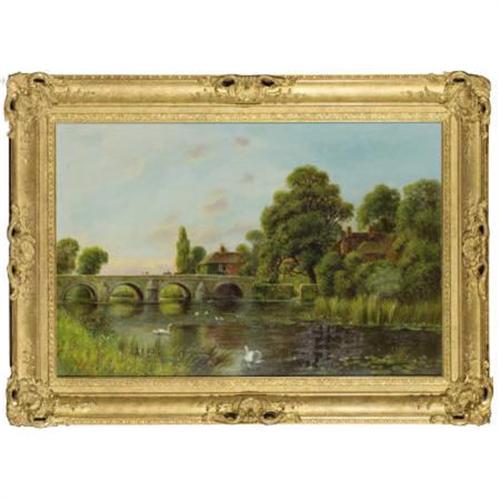 <B>WILLIAM LANGLEY (British, 1852-1922)</B></I><BR><I>Swans by the Bridge</B></I><BR>Oil on canvas<BR>20 x 30 inches (50.8 x 76.2 cm)<BR>Signed lower right: <I>William Langley</B></I><BR> <B>Condition Report:</B> Inpainting, principally throughout the sky and a 2-1/2 x 2-1/2 inch section in lower right quadrant.<BR><BR><b>Shipping:</b> Framed - without Glass, Medium (<a target="_blank" href="http://www.heritageauctions.com/common/shipping.php">view shipping information</a>)