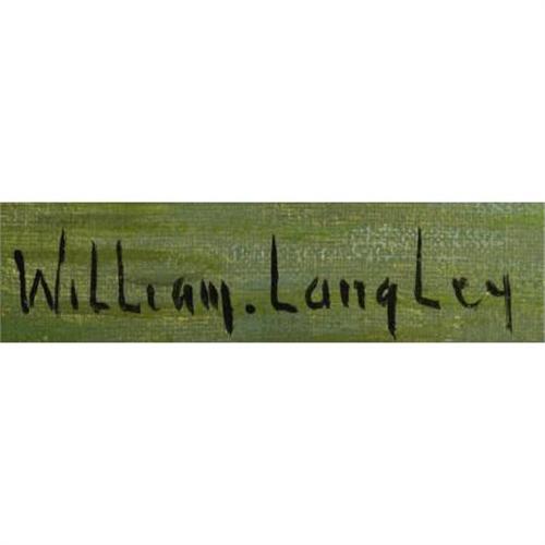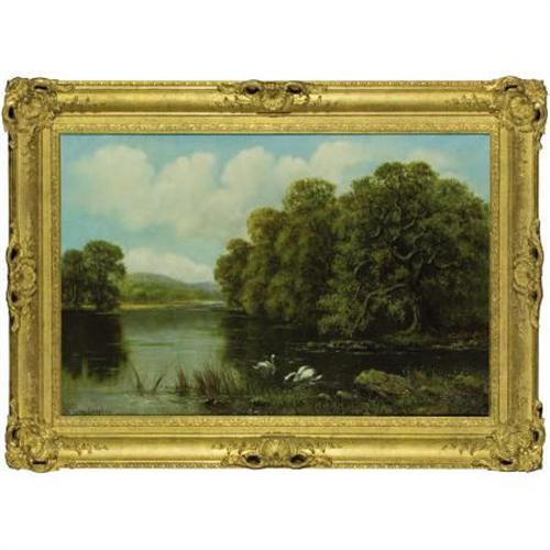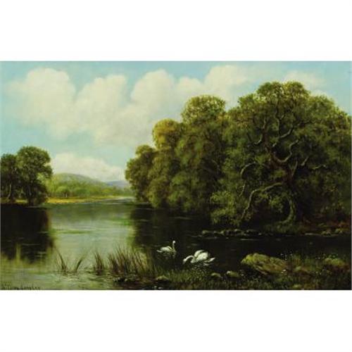 <B>WILLIAM LANGLEY (British, 1852-1922)</B></I><BR><I>Swans on the River</B></I><BR>Oil on canvas<BR>20 x 30 inches (50.8 x 76.2 cm)<BR>Signed lower left: <I>William Langley</B></I><BR> <B>Condition Report:</B> Inpainting throughout sky and in tops of trees, otherwise overall good condition.<BR><BR><b>Shipping:</b> Framed - without Glass, Medium (<a target="_blank" href="http://www.heritageauctions.com/common/shipping.php">view shipping information</a>)