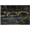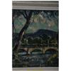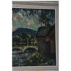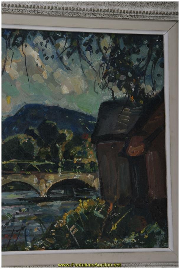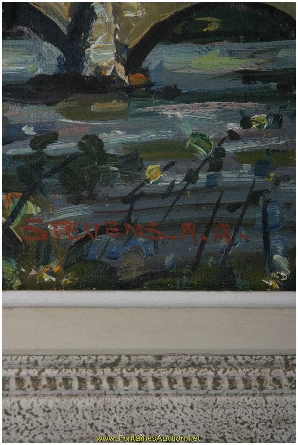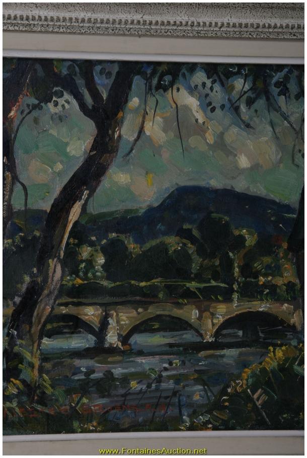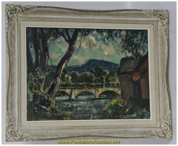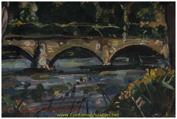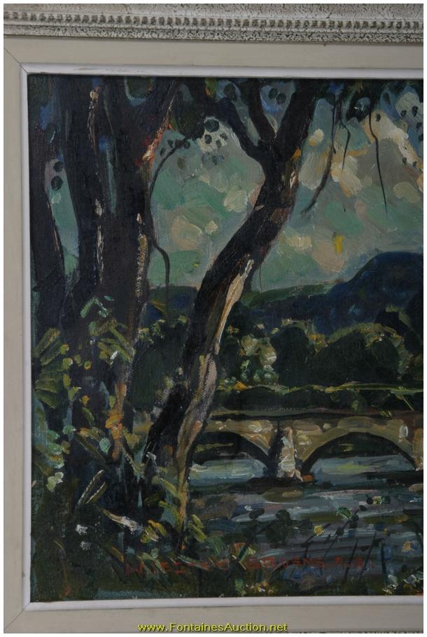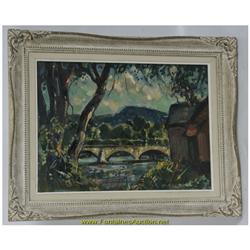 William Lester Stevens O/C Bridge Scene (1888-1969). Beautiful o/c on board scene centered with a stone arch bridge over a river; a blue/green mountainous background and a tree lined riverbank with a cottage to the right, under a blue sky. Signed in red lower right "W. Lester Stevens N.A." In excellent condition; original 20th century frame. 15.5"W x 11.5"H. Estimated Value$1,000 - 1,500.