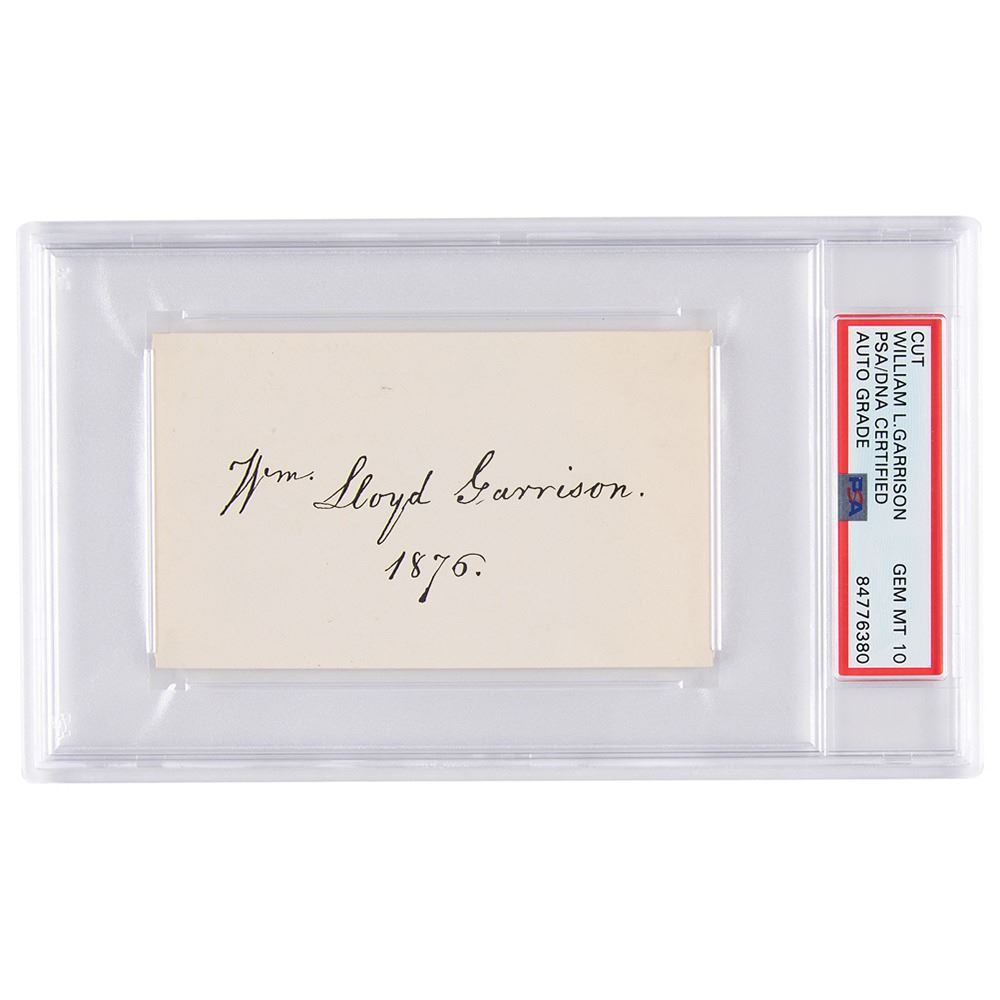 Bold ink signature of William Lloyd Garrison, "Wm. Lloyd Garrison, 1876,& rdquo; on an off-white 4.25 x 2.5 card. In fine condition. Encapsulated and graded by PSA/DNA as "GEM MT 10."