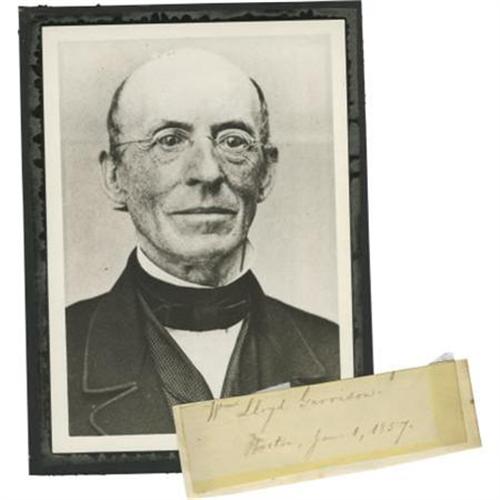 <B>William Lloyd Garrison Signature,</B></I> clipped from a larger document and mounted on a sheet, 5" x 1.5", "<I>Boston, Jan. 1, 1857</B></I>", with a photo. Garrison (1805-1879) was a prominent United States abolitionist, journalist, and social reformer. He is best known as the editor of the radical abolitionist newspaper, <I>The Liberator,</B></I> and as one of the founders of the American Anti-Slavery Society. Slightly faded else fine. <BR><BR><b>Shipping:</b> Flat Material, Small (<a target="_blank" href="http://www.heritageauctions.com/common/shipping.php">view shipping information</a>)