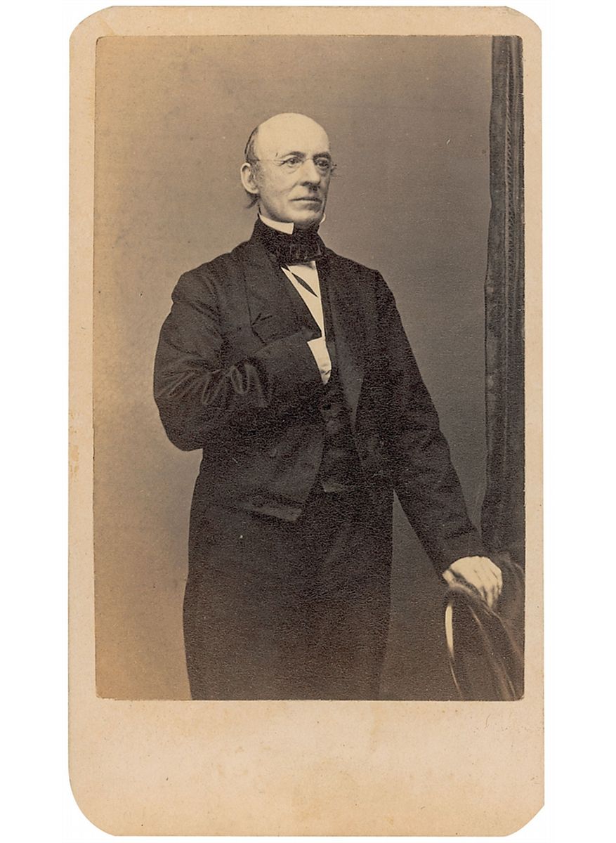 Journalist, editor, and social reformer (1805–1879) best known as one of the most influential abolitionists in the decades leading up to the Civil War. Original 2.25 x 4.25 carte-de-visite three-quarter-length portrait of Garrison in a distinguished pose, signed on the reverse in black ink, “Wm. Lloyd Garrison, 1863.” Published by C. Seaver, Jr., of Boston. In fine condition. This is the first Garrison signed photo we have ever offered, and is especially desirable as it was signed in the year of the Emancipation Proclamation.