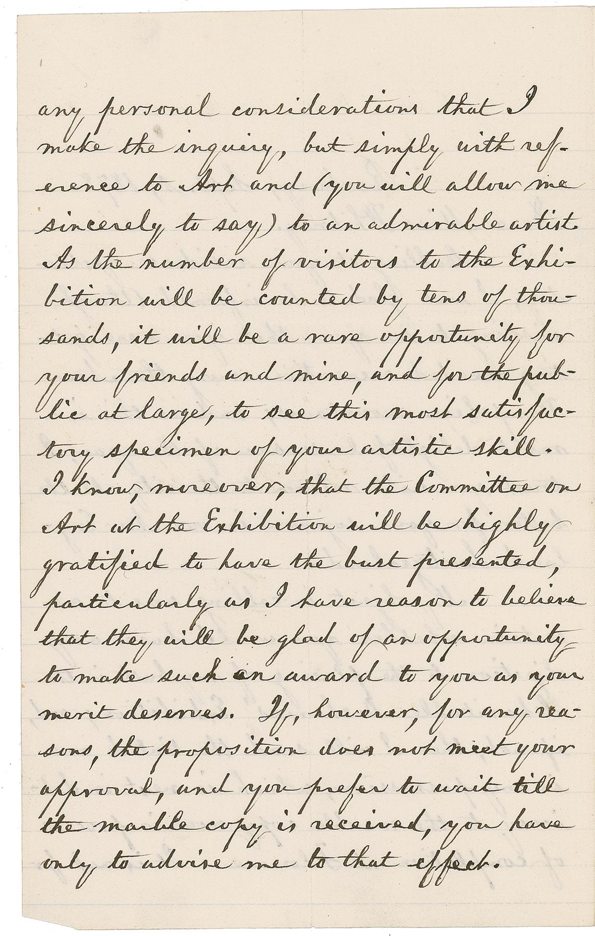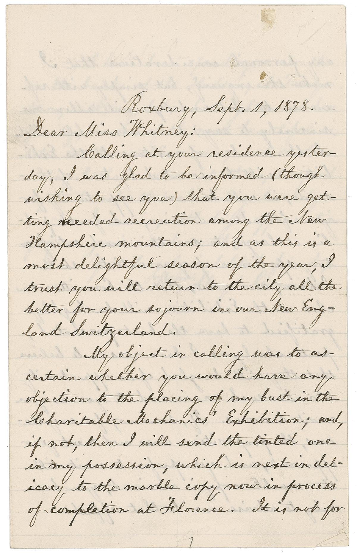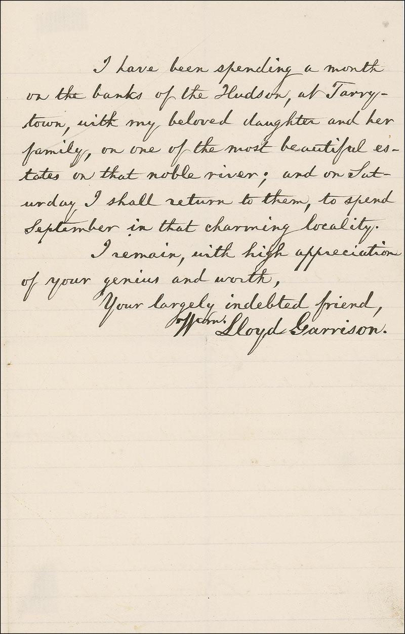 Journalist, editor, and social reformer (1805–1879) best known as one of the most ardent and influential abolitionists in the decades leading up to the Civil War. ALS signed “Wm. Lloyd Garrison,” three pages, lightly-lined on two adjoining sheets, 5 x 8, September 1, 1878. Letter to Miss Whitney regarding his bust sculpture. In part: “Calling at your residence yesterday, I was glad to be informed…that you were getting needed recreation among the New Hampshire mountains…My object in calling was to ascertain whether you would have any objection to the placing of my bust in the Charitable Mechanics Exhibition; and if not, then I will send the tinted one in my possession, which is next in delicacy to the marble copy now in process of completion at Florence.…As the number of visitors to the Exhibition will be counted by tens of thousands, it will be a rare opportunity for your friends and mine, and for the public at large, to see this most satisfactory specimen of your artistic skills.” In fine condition, with intersecting folds, one through a single letter of signature. RRAuction COA.